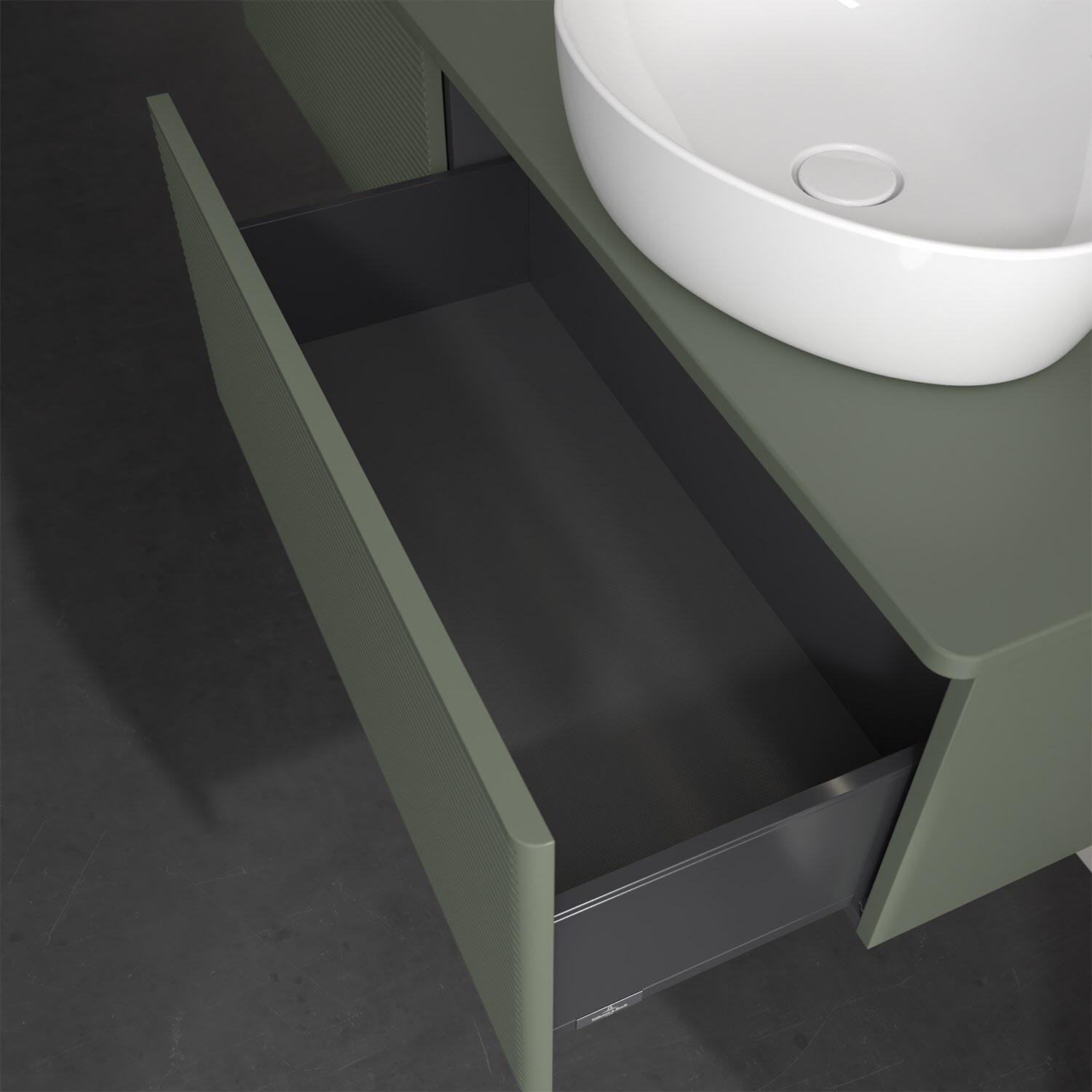 Der wandhängende Antao Waschtischunterschrank bietet mit seinen beiden extra hohen Auszügen und seiner erstaunlichen Größe viel Platz zum Verstauen von Utensilien im Badezimmer. Dank des seitlich platzierten Aufsatzwaschtischs gibt es daneben weiteren Platz für Handtücher, Seifenspender & Co. auf der Waschtischplatte. Inspiriert von der Natur überzeugt der Unterschrank auch optisch mit sanfter Formsprache und abgerundete Kanten. Die grifflosen Auszüge mit strukturierter Front sind mit der Push-to-Open Funktion ausgestattet und verfügen über einen Antirutschboden, damit Utensilien sicher verstaut werden können. Den Überblick behält man dank der warmweißen Auszugsbeleuchtung, die sich automatisch beim Öffnen einschaltet. Mit seiner Vollauszug- und Selbsteinzug-Funktion ist der Schrank einfach praktisch und leicht zu bedienen. Qualität von Villeroy & Boch! Für eine besonders leichte Pflege sorgt die mehrschichtig deckend lackierte Oberfläche.
