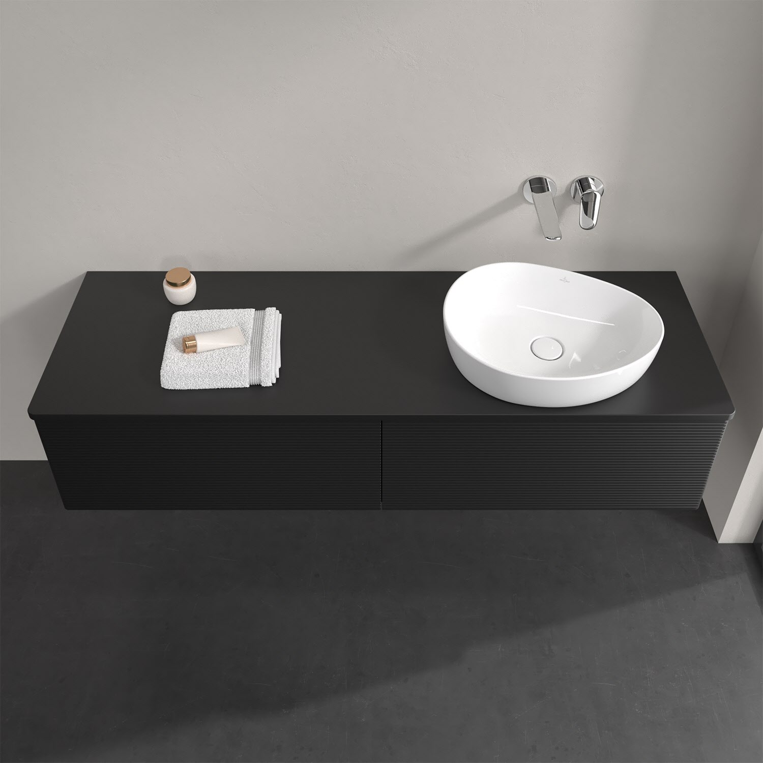 Für diesen Waschbeckenunterschrank stehen Ihnen Aufsatzwaschtische aus verschiedenen Serien zur Verfügung (siehe "Passliste" unter Downloads). Ein ausgewähltes Beispiel finden Sie im Zubehör. Den Waschtisch bitte separat mitbestellen.