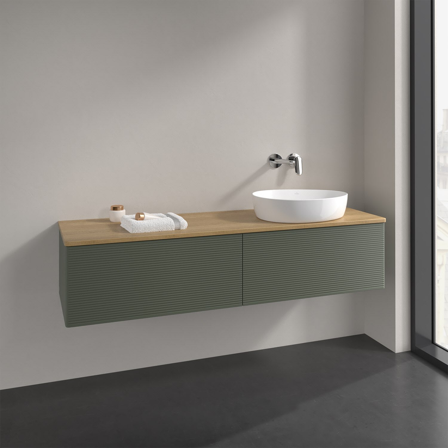 Villeroy & Boch Antao Waschbeckenunterschrank, 160 x 36 cm, 2 Auszüge mit LED-Licht, Front mit Struktur, ohne Hahnloch, für Waschtisch rechts