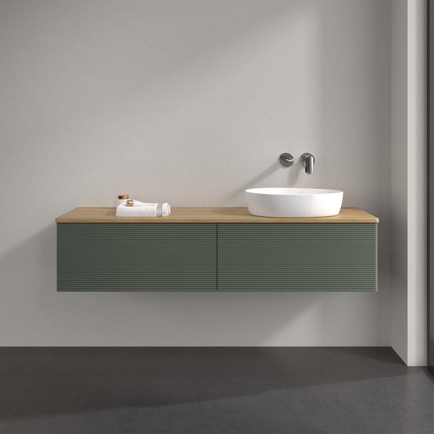 Für diesen Waschbeckenunterschrank stehen Ihnen Aufsatzwaschtische aus verschiedenen Serien zur Verfügung (siehe "Passliste" unter Downloads). Ein ausgewähltes Beispiel finden Sie im Zubehör. Den Waschtisch bitte separat mitbestellen.