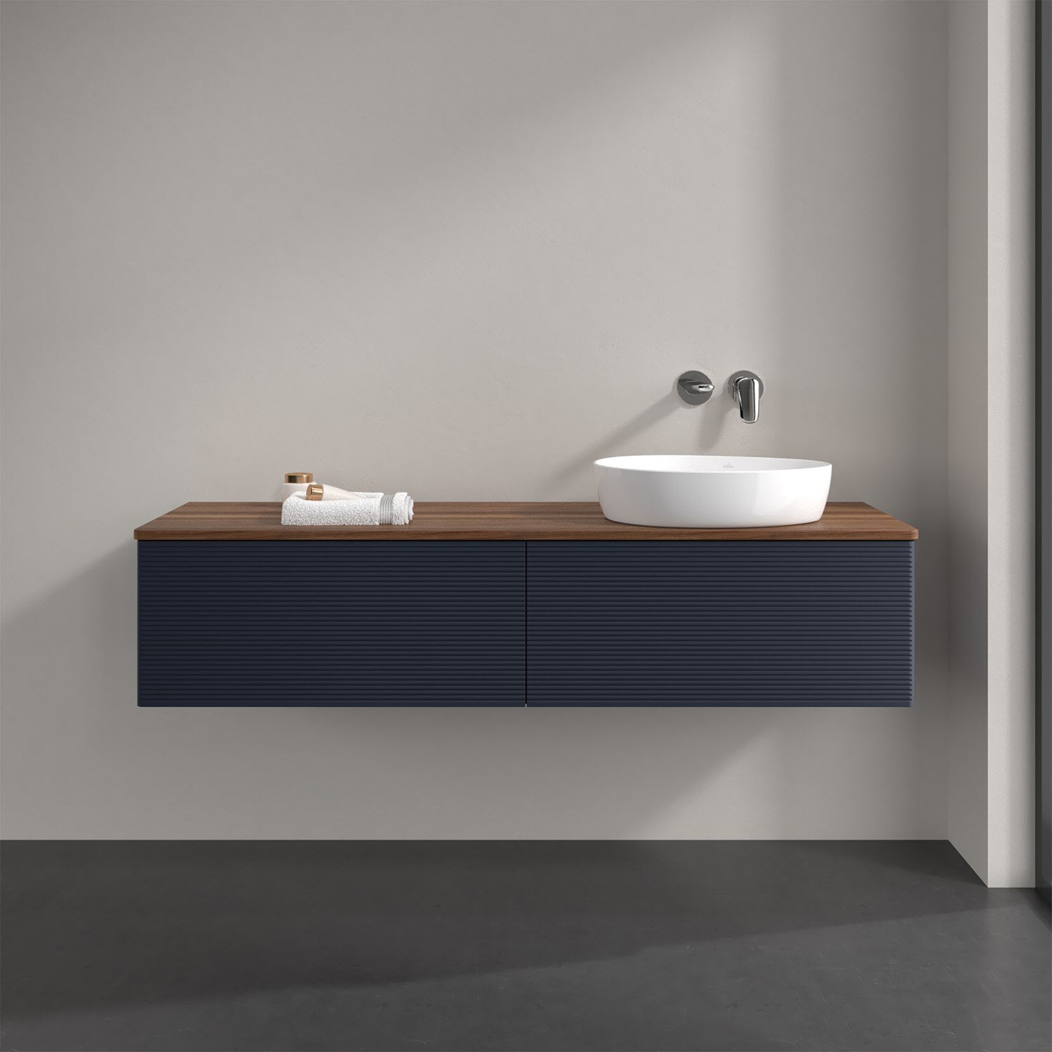Villeroy & Boch Antao Waschbeckenunterschrank, 160 x 36 cm, 2 Auszüge mit LED-Licht, Front mit Struktur, ohne Hahnloch, für Waschtisch rechts
