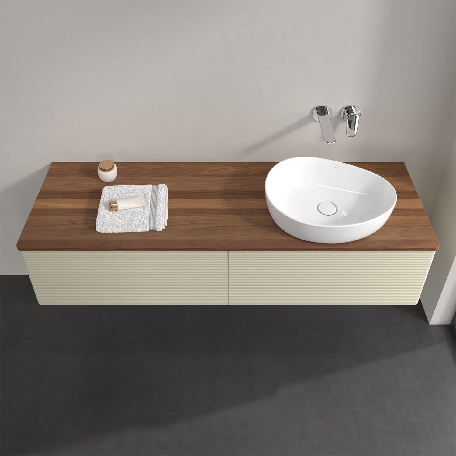 Für diesen Waschbeckenunterschrank stehen Ihnen Aufsatzwaschtische aus verschiedenen Serien zur Verfügung (siehe "Passliste" unter Downloads). Ein ausgewähltes Beispiel finden Sie im Zubehör. Den Waschtisch bitte separat mitbestellen.