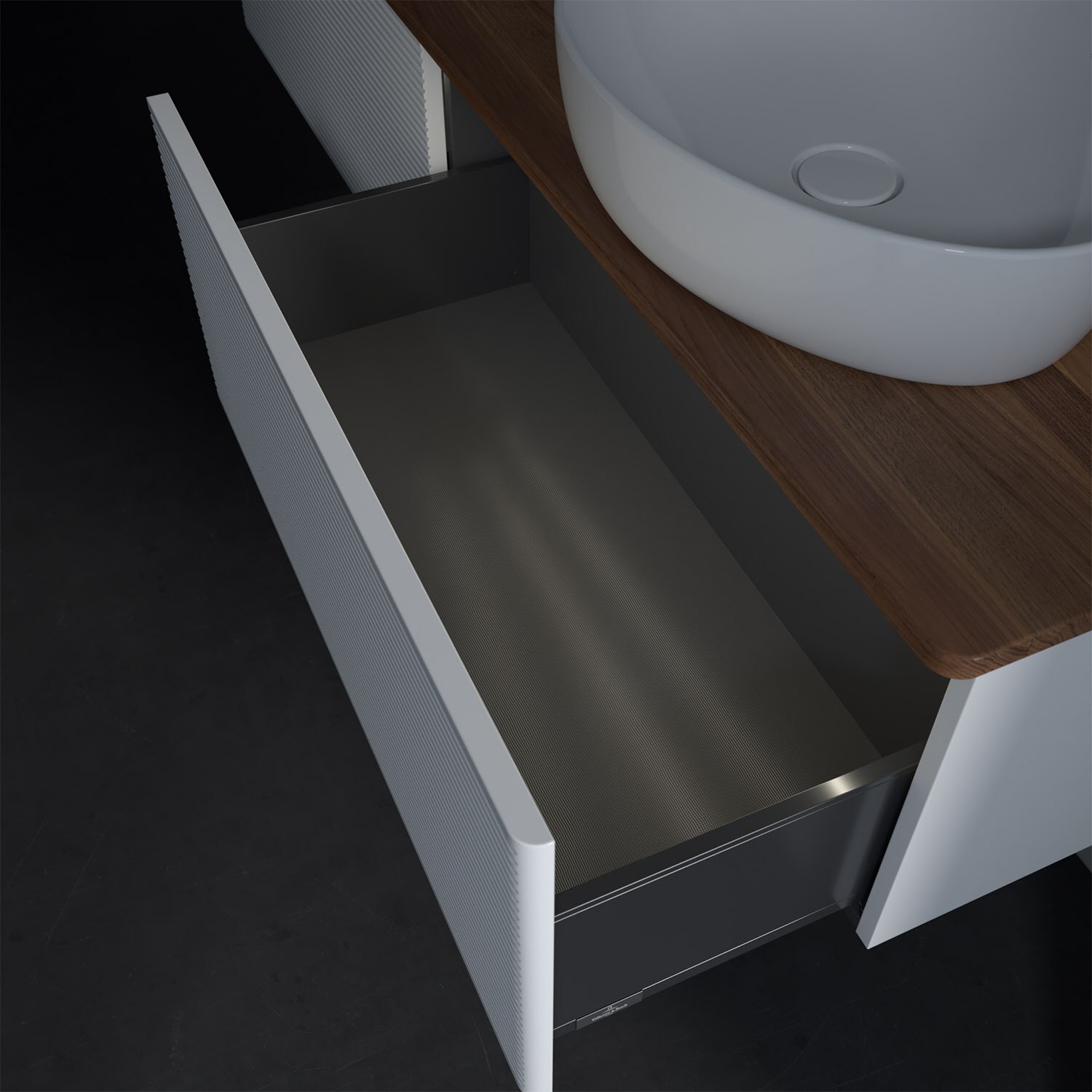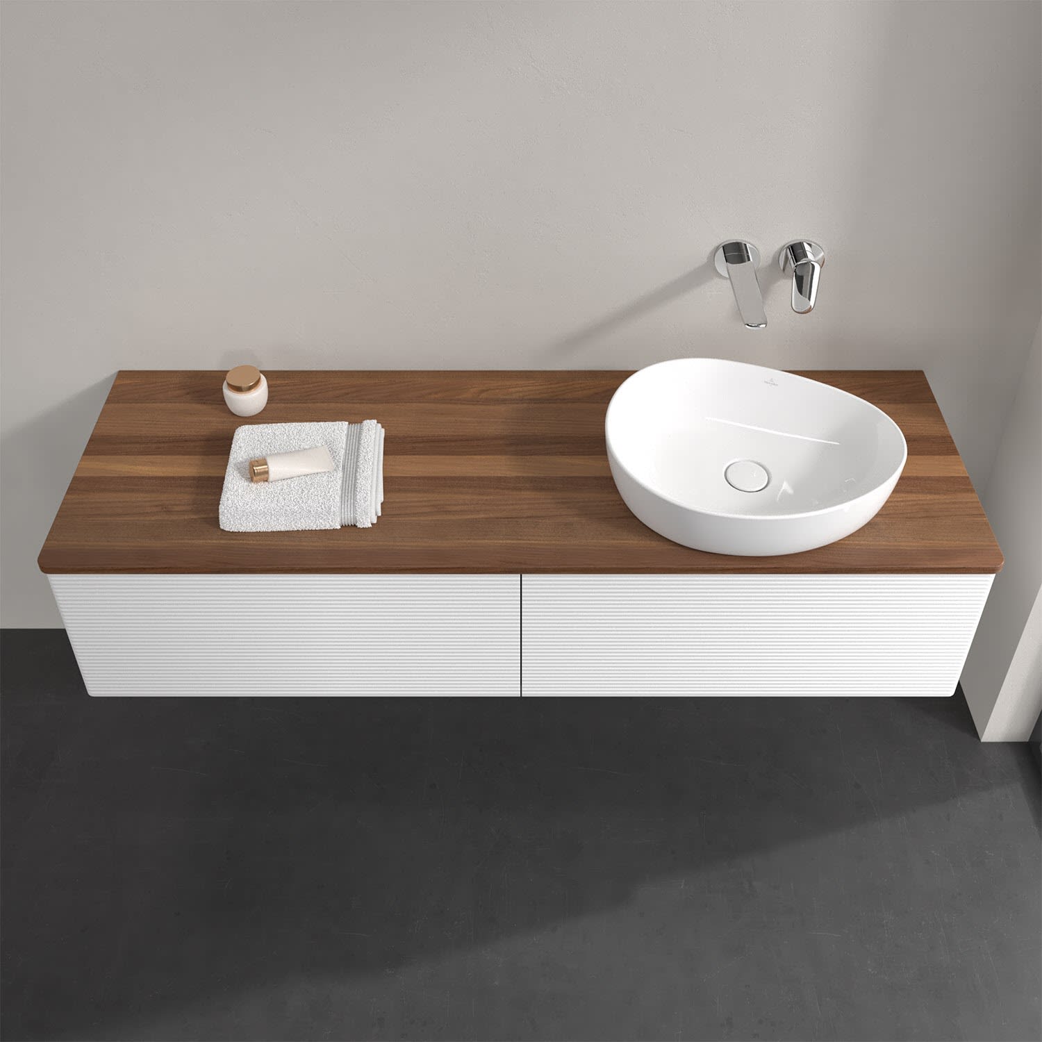 Der wandhängende Antao Waschtischunterschrank bietet mit seinen beiden extra hohen Auszügen und seiner erstaunlichen Größe viel Platz zum Verstauen von Utensilien im Badezimmer. Dank des seitlich platzierten Aufsatzwaschtischs gibt es daneben weiteren Platz für Handtücher, Seifenspender & Co. auf der Waschtischplatte. Inspiriert von der Natur überzeugt der Unterschrank auch optisch mit sanfter Formsprache und abgerundete Kanten. Die grifflosen Auszüge mit strukturierter Front sind mit der Push-to-Open Funktion ausgestattet und verfügen über einen Antirutschboden, damit Utensilien sicher verstaut werden können. Den Überblick behält man dank der warmweißen Auszugsbeleuchtung, die sich automatisch beim Öffnen einschaltet. Mit seiner Vollauszug- und Selbsteinzug-Funktion ist der Schrank einfach praktisch und leicht zu bedienen. Qualität von Villeroy & Boch! Für eine besonders leichte Pflege sorgt die mehrschichtig deckend lackierte Oberfläche. Bei der Ausführung in Massivholz wird dank des verarbeiteten Massivholzes jedes Möbel zu einem Unikat, das sich durch das lebendige Naturmaterial durch seine einzigartige Struktur und Maserung auszeichnet.