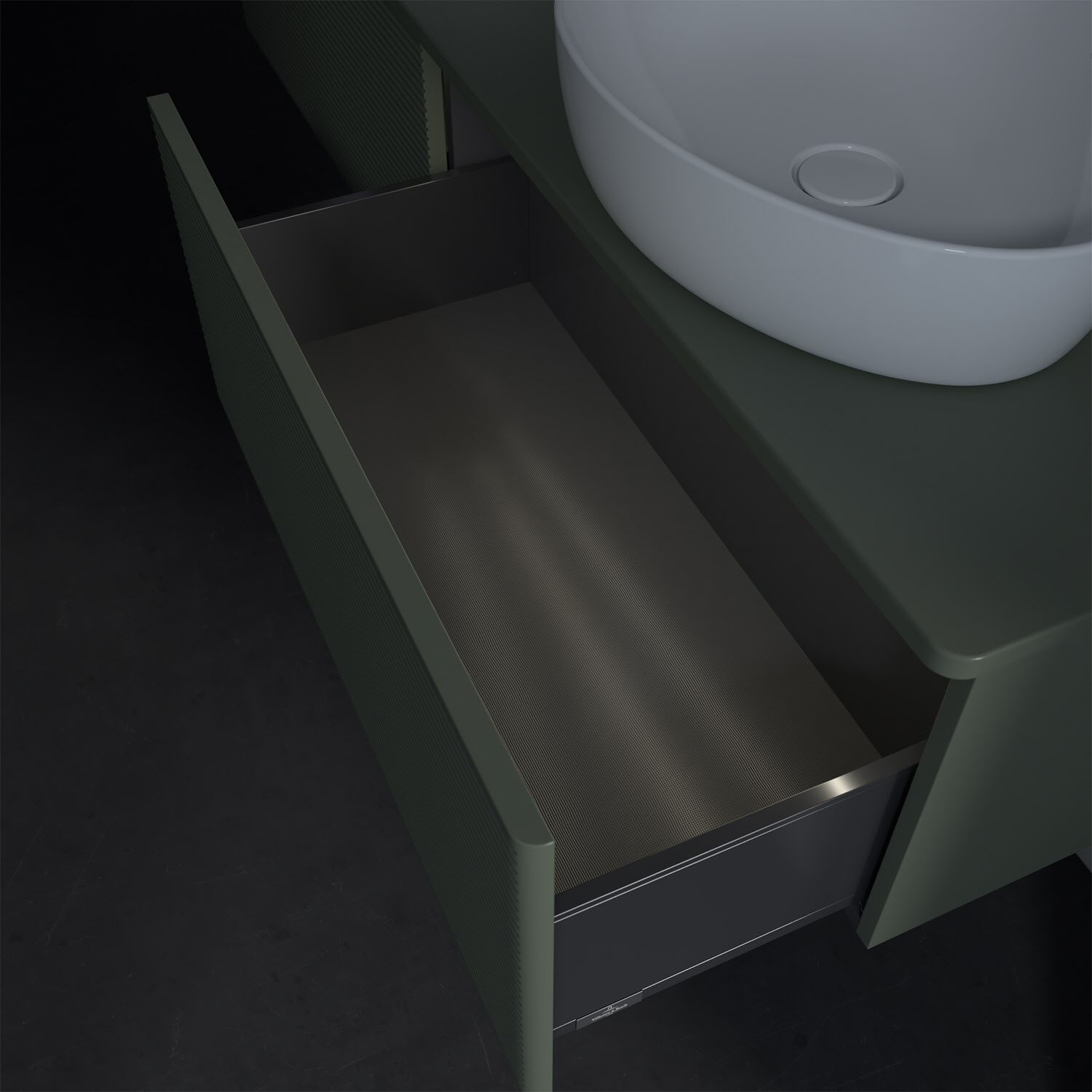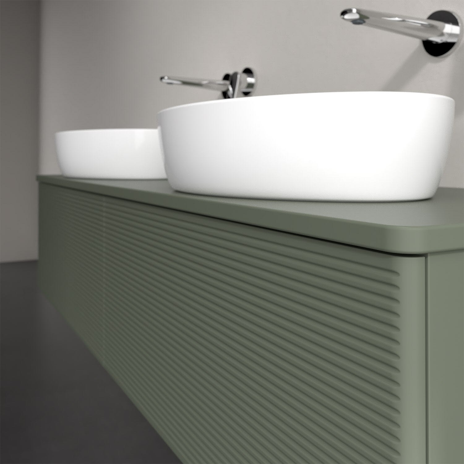 Der wandhängende Antao Waschtischunterschrank für zwei Aufsatzwaschtische bietet mit seinen beiden extra hohen Auszügen und seiner erstaunlichen Größe viel Platz zum Verstauen von Utensilien im Badezimmer. Inspiriert von der Natur überzeugt der Unterschrank auch optisch mit sanfter Formsprache und abgerundete Kanten. Die grifflosen Auszüge mit strukturierter Front sind mit der Push-to-Open Funktion ausgestattet und verfügen über einen Antirutschboden, damit Utensilien sicher verstaut werden können. Den Überblick behält man dank der warmweißen Auszugsbeleuchtung, die sich automatisch beim Öffnen einschaltet. Mit seiner Vollauszug- und Selbsteinzug-Funktion ist der Schrank einfach praktisch und leicht zu bedienen. Qualität von Villeroy & Boch! Für eine besonders leichte Pflege sorgt die mehrschichtig deckend lackierte Oberfläche.