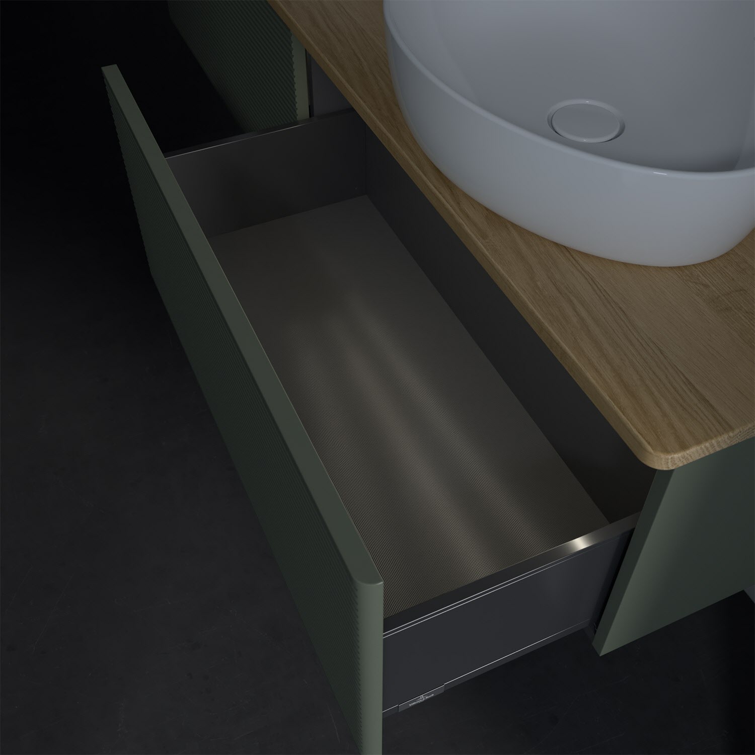 Der wandhängende Antao Waschtischunterschrank für zwei Aufsatzwaschtische bietet mit seinen beiden extra hohen Auszügen und seiner erstaunlichen Größe viel Platz zum Verstauen von Utensilien im Badezimmer. Inspiriert von der Natur überzeugt der Unterschrank auch optisch mit sanfter Formsprache und abgerundete Kanten. Die grifflosen Auszüge mit strukturierter Front sind mit der Push-to-Open Funktion ausgestattet und verfügen über einen Antirutschboden, damit Utensilien sicher verstaut werden können. Den Überblick behält man dank der warmweißen Auszugsbeleuchtung, die sich automatisch beim Öffnen einschaltet. Mit seiner Vollauszug- und Selbsteinzug-Funktion ist der Schrank einfach praktisch und leicht zu bedienen. Qualität von Villeroy & Boch! Für eine besonders leichte Pflege sorgt die mehrschichtig deckend lackierte Oberfläche. Bei der Ausführung in Massivholz wird dank des verarbeiteten Massivholzes jedes Möbel zu einem Unikat, das sich durch das lebendige Naturmaterial durch seine einzigartige Struktur und Maserung auszeichnet.