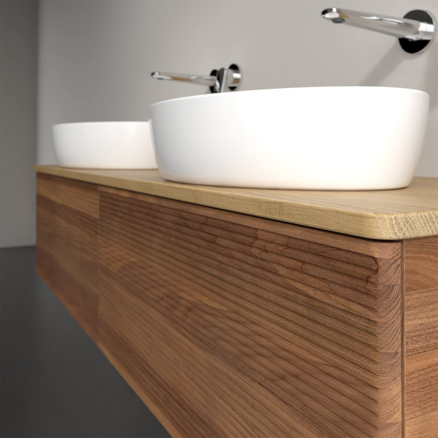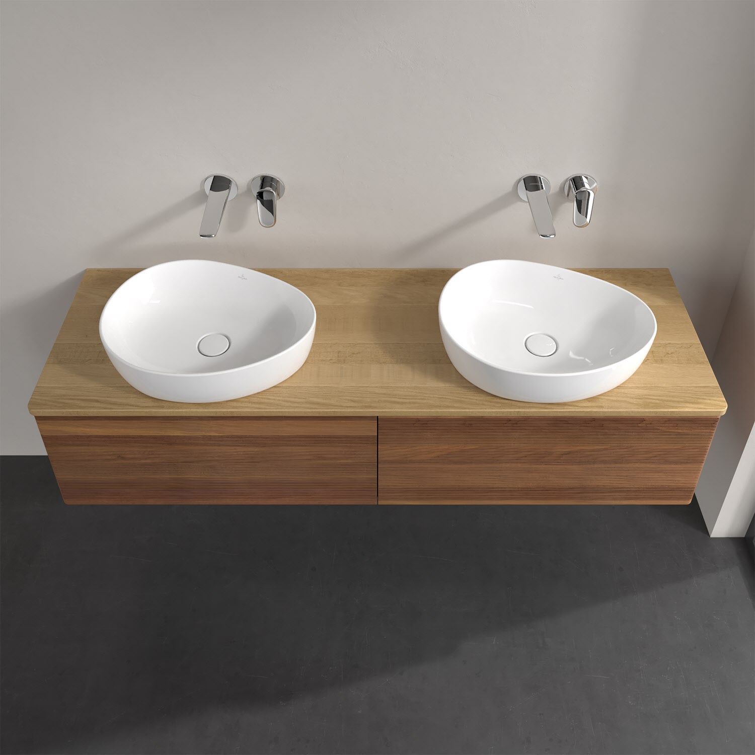 Der wandhängende Antao Waschtischunterschrank für zwei Aufsatzwaschtische bietet mit seinen beiden extra hohen Auszügen und seiner erstaunlichen Größe viel Platz zum Verstauen von Utensilien im Badezimmer. Inspiriert von der Natur überzeugt der Unterschrank auch optisch mit sanfter Formsprache und abgerundete Kanten. Die grifflosen Auszüge mit strukturierter Front sind mit der Push-to-Open Funktion ausgestattet und verfügen über einen Antirutschboden, damit Utensilien sicher verstaut werden können. Den Überblick behält man dank der warmweißen Auszugsbeleuchtung, die sich automatisch beim Öffnen einschaltet. Mit seiner Vollauszug- und Selbsteinzug-Funktion ist der Schrank einfach praktisch und leicht zu bedienen. Qualität von Villeroy & Boch! Für eine besonders leichte Pflege sorgt die mehrschichtig deckend lackierte Oberfläche. Bei der Ausführung in Massivholz wird dank des verarbeiteten Massivholzes jedes Möbel zu einem Unikat, das sich durch das lebendige Naturmaterial durch seine einzigartige Struktur und Maserung auszeichnet.