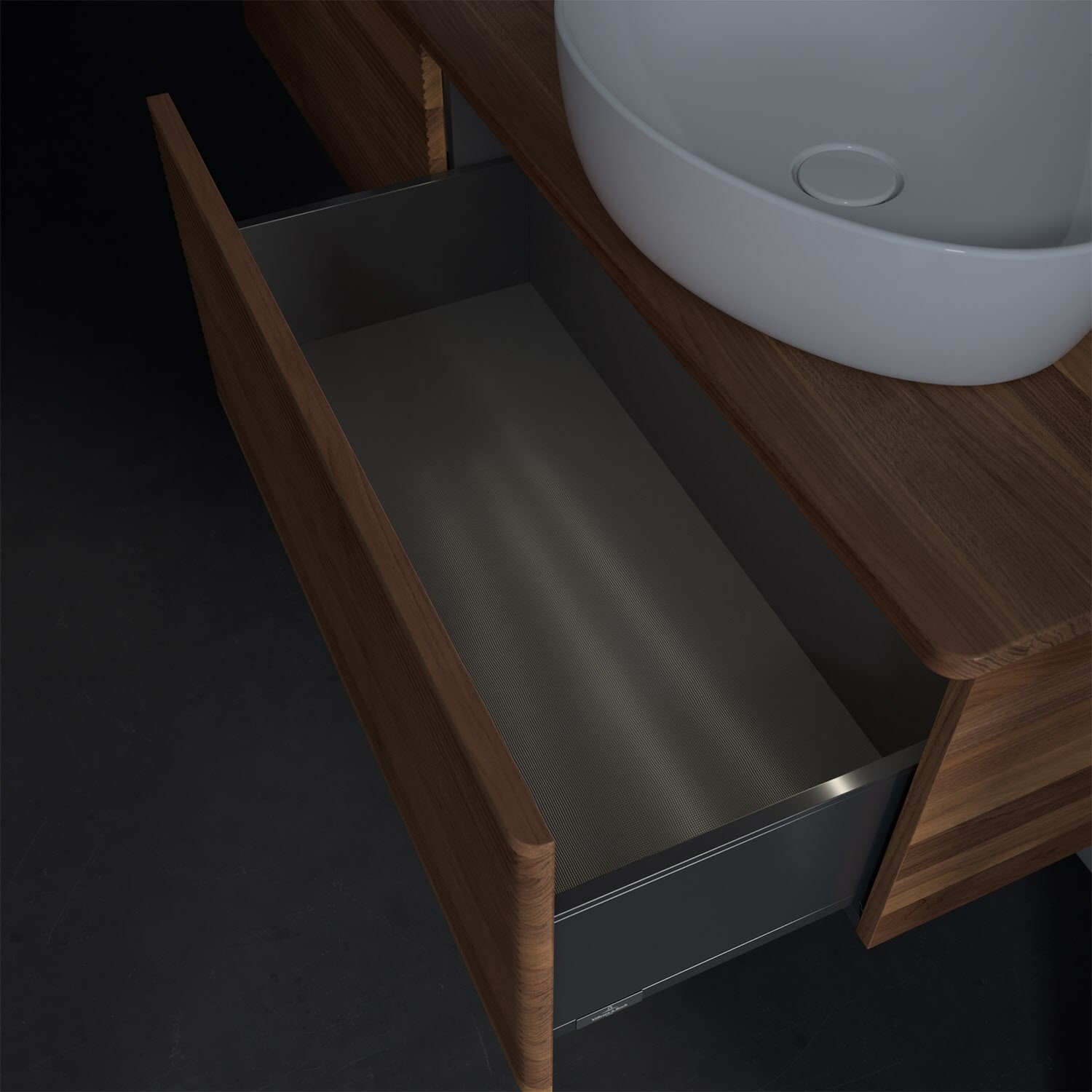 Der wandhängende Antao Waschtischunterschrank für zwei Aufsatzwaschtische bietet mit seinen beiden extra hohen Auszügen und seiner erstaunlichen Größe viel Platz zum Verstauen von Utensilien im Badezimmer. Inspiriert von der Natur überzeugt der Unterschrank auch optisch mit sanfter Formsprache und abgerundete Kanten. Die grifflosen Auszüge mit strukturierter Front sind mit der Push-to-Open Funktion ausgestattet und verfügen über einen Antirutschboden, damit Utensilien sicher verstaut werden können. Den Überblick behält man dank der warmweißen Auszugsbeleuchtung, die sich automatisch beim Öffnen einschaltet. Mit seiner Vollauszug- und Selbsteinzug-Funktion ist der Schrank einfach praktisch und leicht zu bedienen. Qualität von Villeroy & Boch! Für eine besonders leichte Pflege sorgt die mehrschichtig deckend lackierte Oberfläche. Bei der Ausführung in Massivholz wird dank des verarbeiteten Massivholzes jedes Möbel zu einem Unikat, das sich durch das lebendige Naturmaterial durch seine einzigartige Struktur und Maserung auszeichnet.