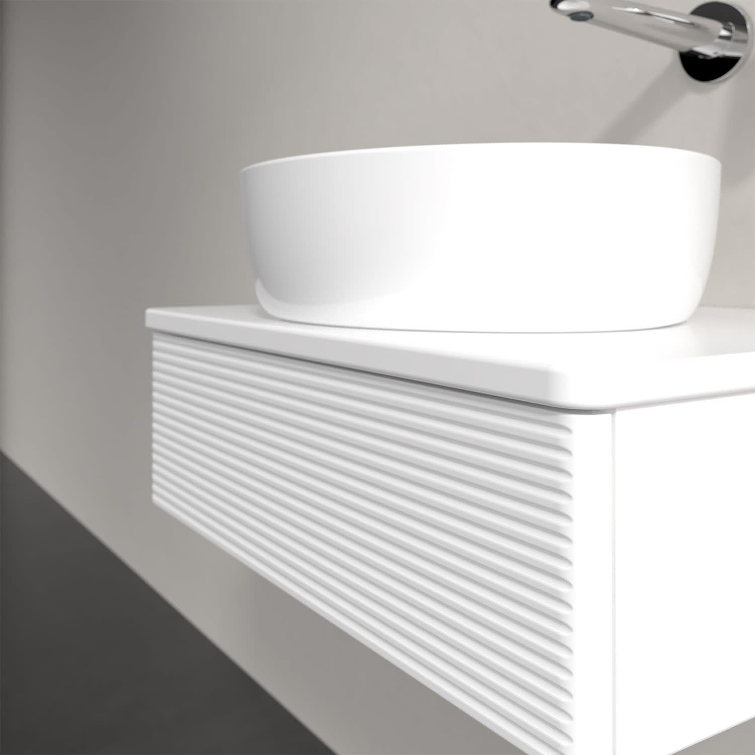 Wenig Platz im Badezimmer und dennoch soll es gemütlich und ordentlich sein? Dann ist der wandhängende Antao Waschtischunterschrank mit seinen sanft abgerundeten Kanten die ideale Lösung. Das geräumige Möbel bietet ausreichend Stauraum für alle nötigen Badutensilien. Zum Öffnen genügt dank der Push-to-Open Funktion ein leichter Druck auf den grifflosen Auszug mit strukturierter Front, der sich dann in seiner vollen Tiefe öffnet. Dabei wird gleichzeitig die angenehme Auszugsbeleuchtung in Warmweiß aktiviert. Das garantiert den benötigen Überblick! Praktisch ist auch der integrierte Antirutschboden und die SoftClosing Funktion, die ein Umfallen oder Verrutschen der verstauten Produkte verhindern. Villeroy & Boch hat alles durchdacht! Für eine besonders leichte Pflege sorgt die mehrschichtig deckend lackierte Oberfläche.