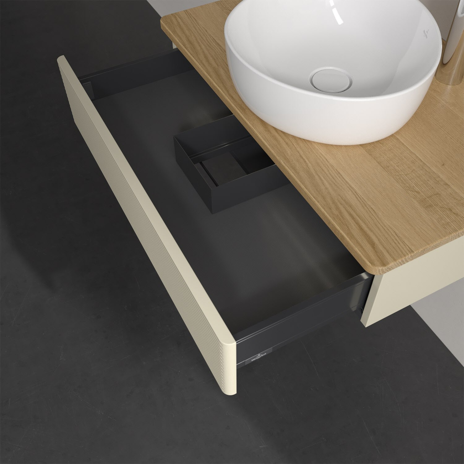 - kein Umfallen oder Verrutschen von Pflegeprodukten in den Schubladen dank rutschhemmendem Boden