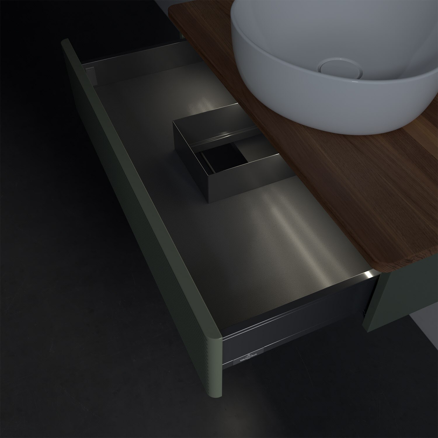 - in Schublade integrierte LED-Leiste mit warmweißem Licht zur Beleuchtung des Innenlebens