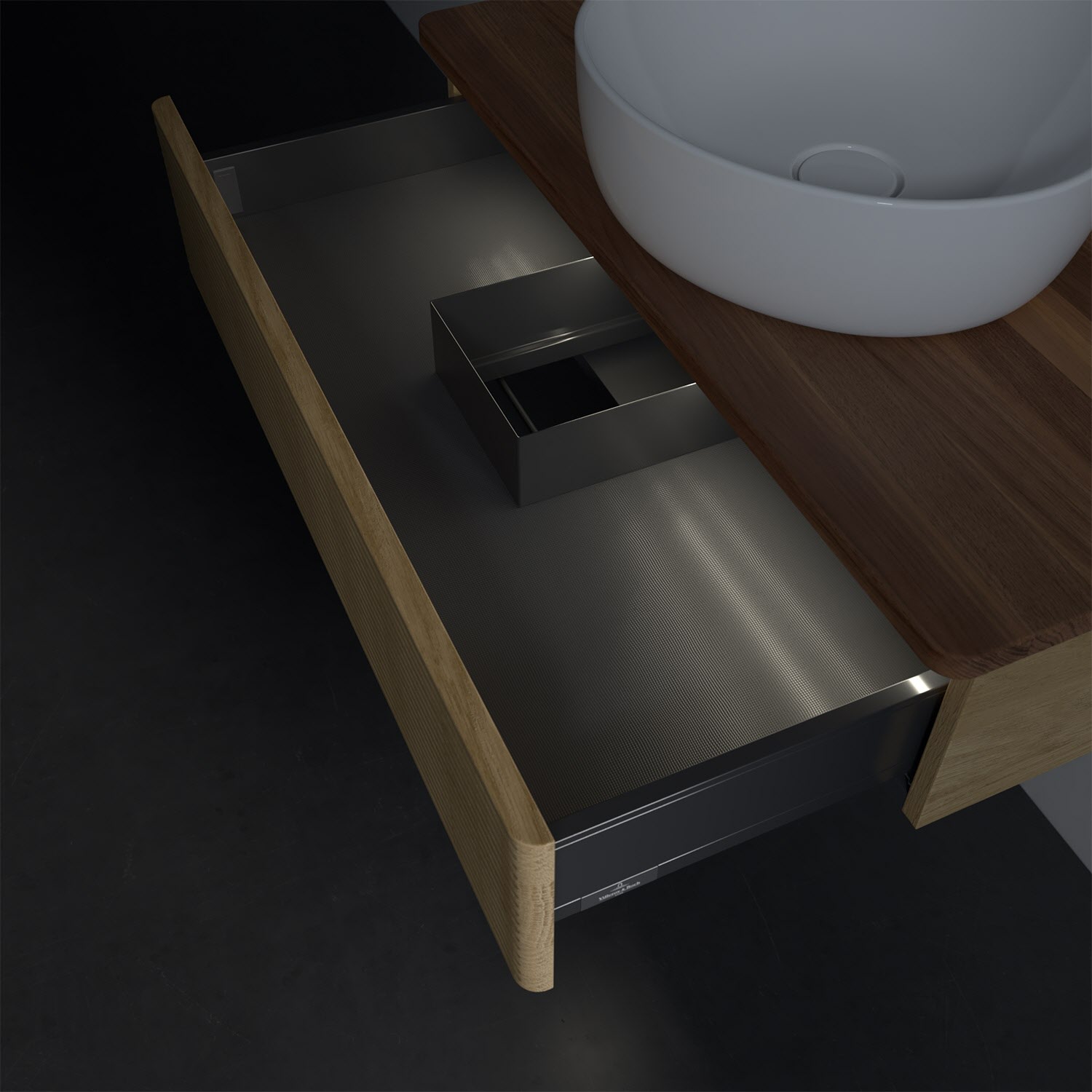 - in Schublade integrierte LED-Leiste mit warmweißem Licht zur Beleuchtung des Innenlebens