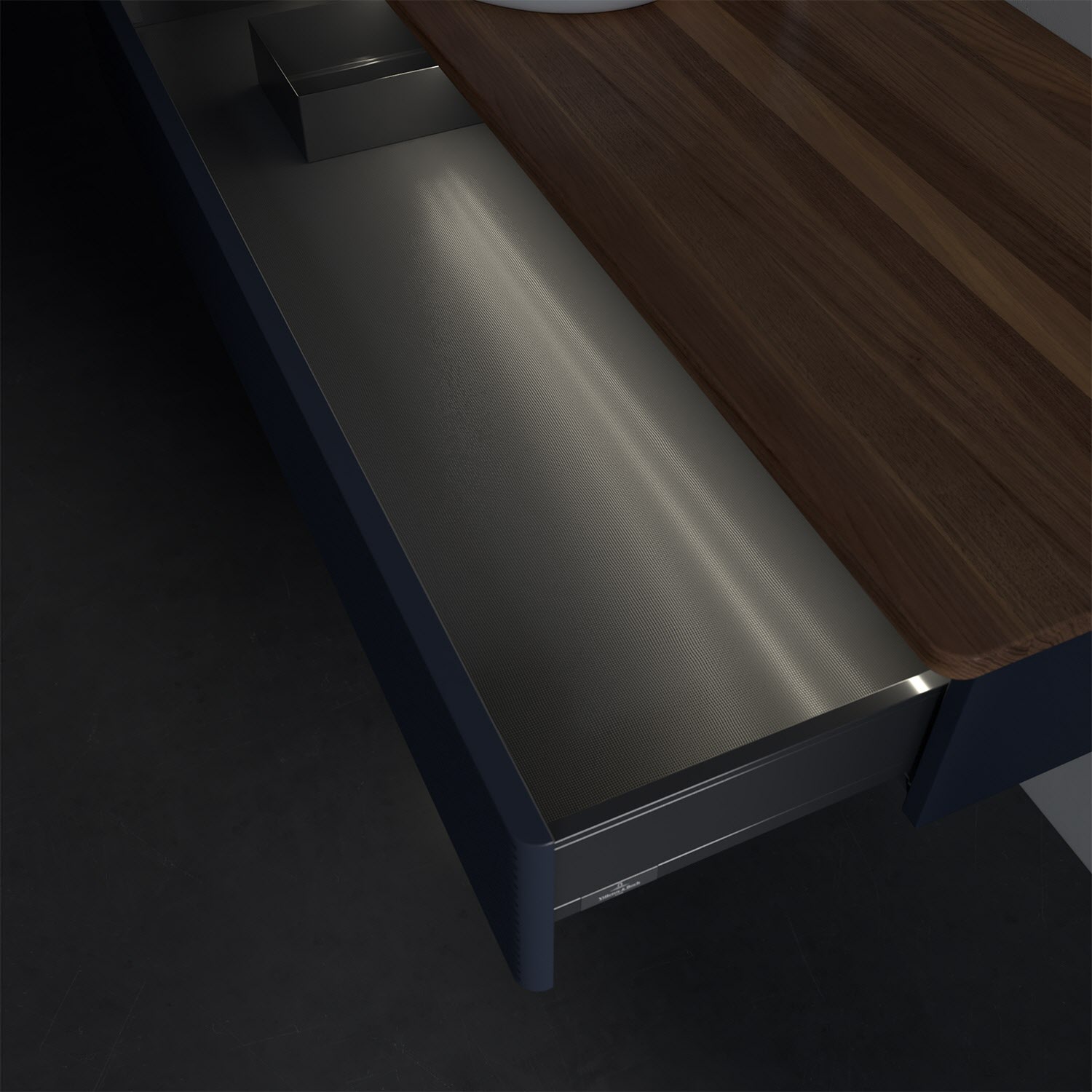 Der wandhängende Antao Waschtischunterschrank von Villeroy & Boch bietet nicht nur jede Menge Stauraum – er ist dank seines naturinspirierten Designs mit seinen abgerundeten Kanten auch noch besonders stilvoll und schafft eine gemütliche Atmosphäre im Badezimmer. Auf der Waschtischplatte bietet sich seitlich des Waschtischs viel Platz für Zahnbürstenbecher oder Seifenspender. Der geräumige Auszug bietet viel Platz, um alles Notwendige zu verstauen und Ordnung zu halten. Öffnen lässt er sich durch leichten Druck auf die strukturierte Front. Dabei aktiviert sich übrigens die Auszugsbeleuchtung in angenehmem Warmweiß. Dank Vollauszug hat man immer alles im Blick und der Antirutschboden verhindert ein Umfallen oder Verrutschen der Gegenstände. Einfach clever! Für eine besonders leichte Pflege sorgt die mehrschichtig deckend lackierte Oberfläche. Bei der Ausführung in Massivholz wird dank des verarbeiteten Massivholzes jedes Möbel zu einem Unikat, das sich durch das lebendige Naturmaterial durch seine einzigartige Struktur und Maserung auszeichnet.