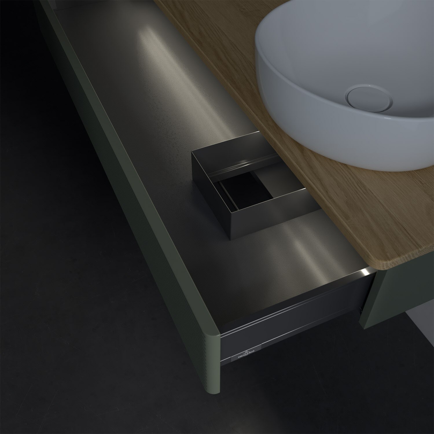 - in Schublade integrierte LED-Leiste mit warmweißem Licht zur Beleuchtung des Innenlebens