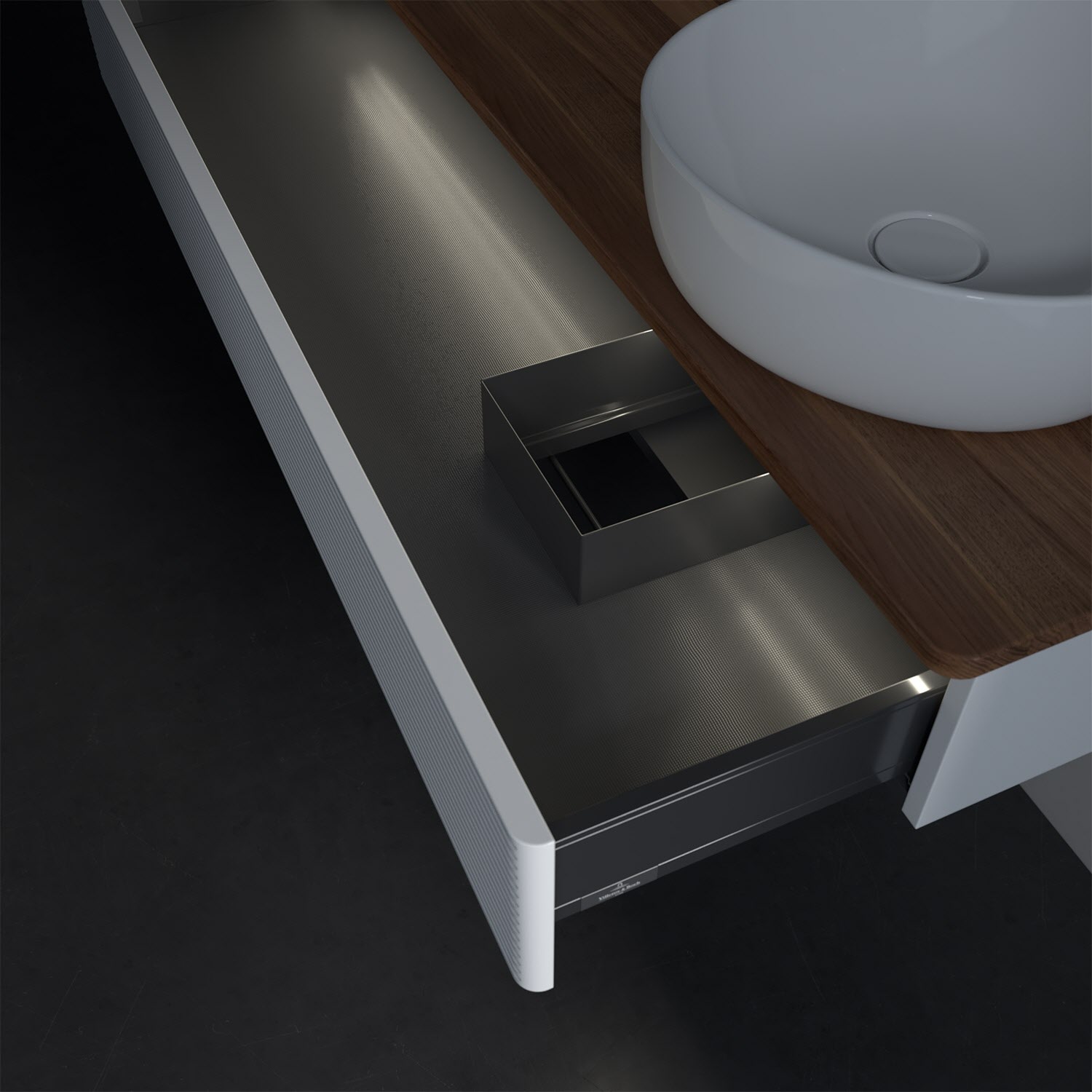 - in Schublade integrierte LED-Leiste mit warmweißem Licht zur Beleuchtung des Innenlebens