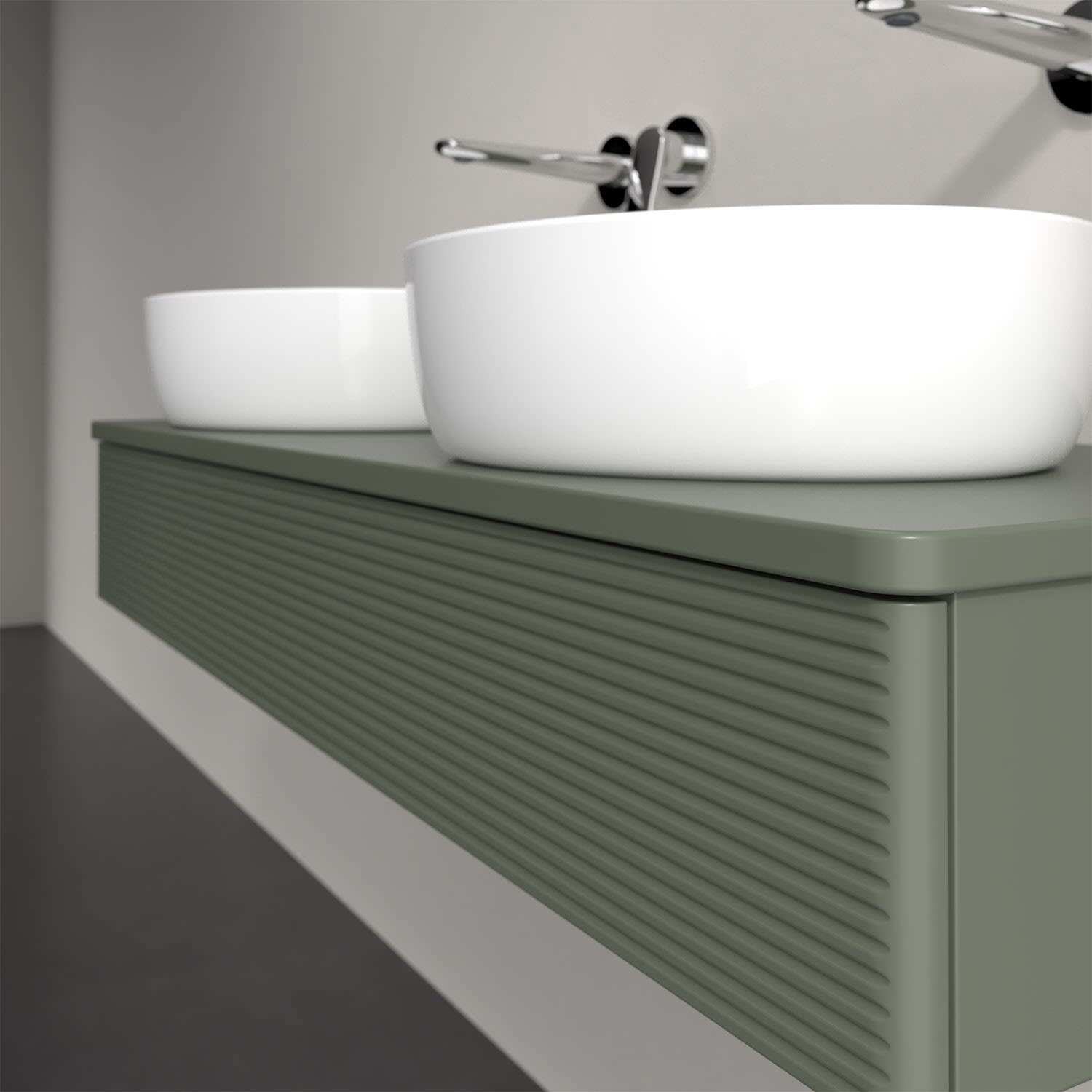 Der wandhängende Antao Waschtischunterschrank von Villeroy & Boch bietet nicht nur jede Menge Stauraum – er ist dank seines naturinspirierten Designs mit seinen abgerundeten Kanten auch noch besonders stilvoll und schafft eine gemütliche Atmosphäre im Badezimmer. Kombiniert mit zwei passenden Aufsatzwaschtischen also die ideale Wahl. Der geräumige Auszug bietet viel Platz, um alles Notwendige zu verstauen und Ordnung zu halten. Öffnen lässt er sich durch leichten Druck auf die strukturierte Front. Dabei aktiviert sich übrigens die Auszugsbeleuchtung in angenehmem Warmweiß. Dank Vollauszug hat man immer alles im Blick und der Antirutschboden verhindert ein Umfallen oder Verrutschen der Gegenstände. Einfach clever! Für eine besonders leichte Pflege sorgt die mehrschichtig deckend lackierte Oberfläche.