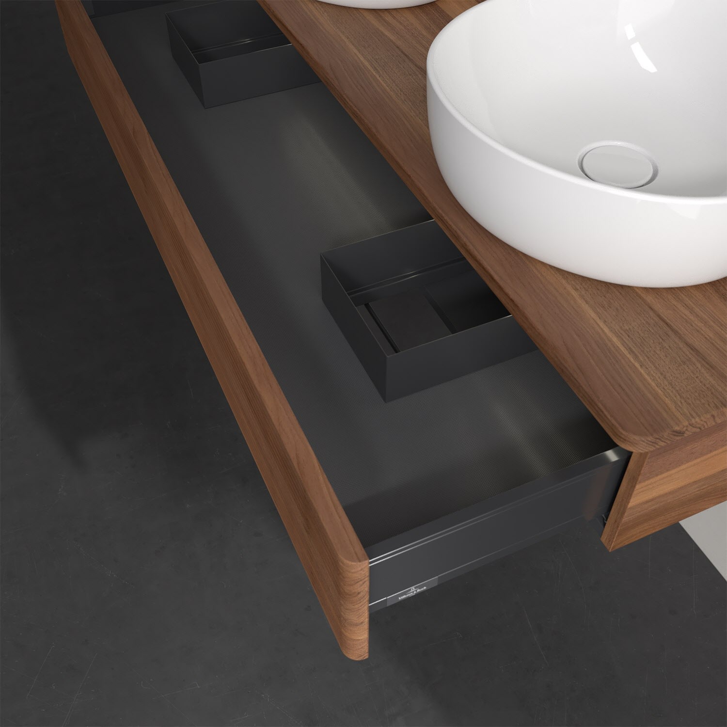 Der wandhängende Antao Waschtischunterschrank von Villeroy & Boch bietet nicht nur jede Menge Stauraum – er ist dank seines naturinspirierten Designs mit seinen abgerundeten Kanten auch noch besonders stilvoll und schafft eine gemütliche Atmosphäre im Badezimmer. Kombiniert mit zwei passenden Aufsatzwaschtischen also die ideale Wahl. Der geräumige Auszug bietet viel Platz, um alles Notwendige zu verstauen und Ordnung zu halten. Öffnen lässt er sich durch leichten Druck auf die strukturierte Front. Dabei aktiviert sich übrigens die Auszugsbeleuchtung in angenehmem Warmweiß. Dank Vollauszug hat man immer alles im Blick und der Antirutschboden verhindert ein Umfallen oder Verrutschen der Gegenstände. Einfach clever! Für eine besonders leichte Pflege sorgt die mehrschichtig deckend lackierte Oberfläche. Bei der Ausführung in Massivholz wird dank des verarbeiteten Massivholzes jedes Möbel zu einem Unikat, das sich durch das lebendige Naturmaterial durch seine einzigartige Struktur und Maserung auszeichnet.