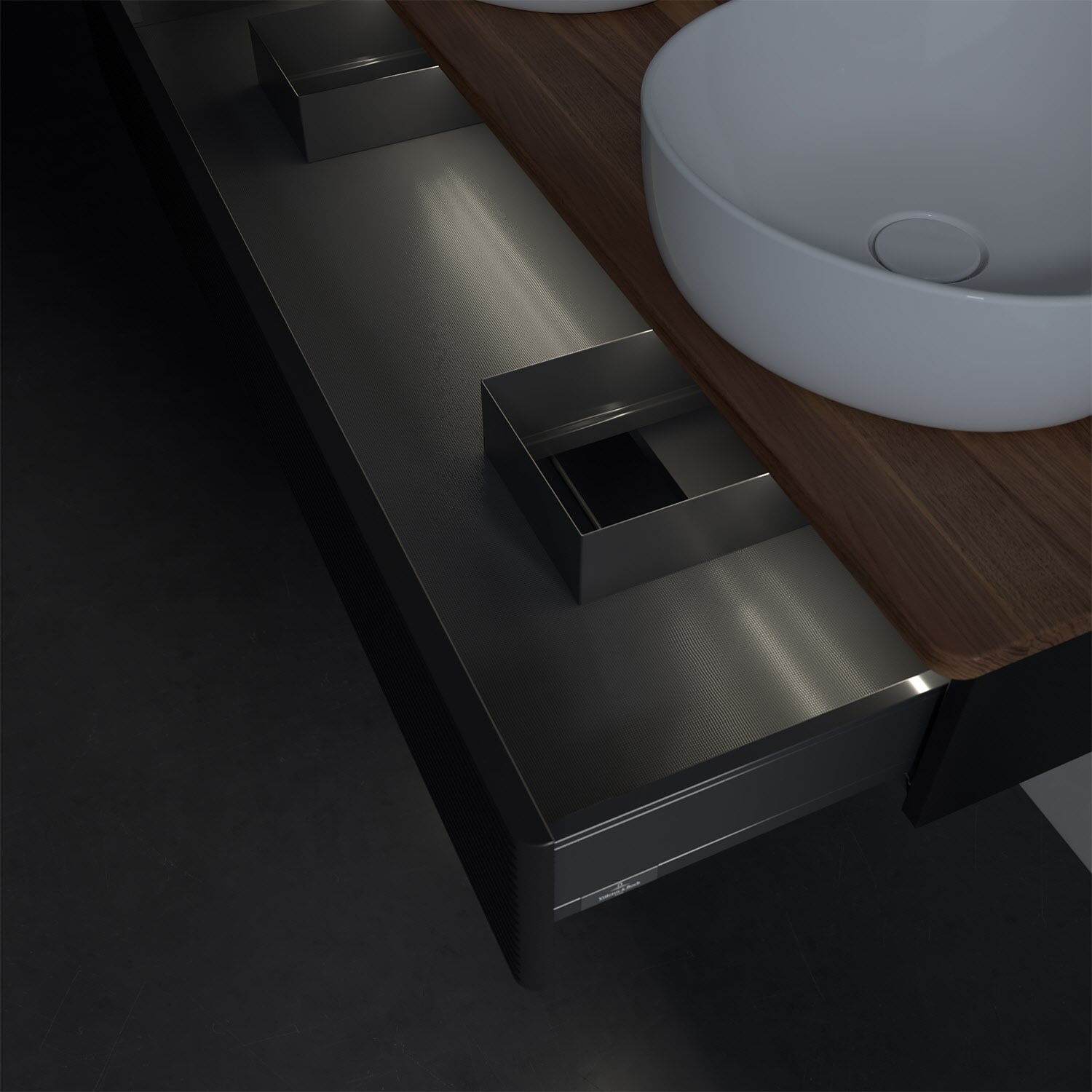 Der wandhängende Antao Waschtischunterschrank von Villeroy & Boch bietet nicht nur jede Menge Stauraum – er ist dank seines naturinspirierten Designs mit seinen abgerundeten Kanten auch noch besonders stilvoll und schafft eine gemütliche Atmosphäre im Badezimmer. Kombiniert mit zwei passenden Aufsatzwaschtischen also die ideale Wahl. Der geräumige Auszug bietet viel Platz, um alles Notwendige zu verstauen und Ordnung zu halten. Öffnen lässt er sich durch leichten Druck auf die strukturierte Front. Dabei aktiviert sich übrigens die Auszugsbeleuchtung in angenehmem Warmweiß. Dank Vollauszug hat man immer alles im Blick und der Antirutschboden verhindert ein Umfallen oder Verrutschen der Gegenstände. Einfach clever! Für eine besonders leichte Pflege sorgt die mehrschichtig deckend lackierte Oberfläche. Bei der Ausführung in Massivholz wird dank des verarbeiteten Massivholzes jedes Möbel zu einem Unikat, das sich durch das lebendige Naturmaterial durch seine einzigartige Struktur und Maserung auszeichnet.