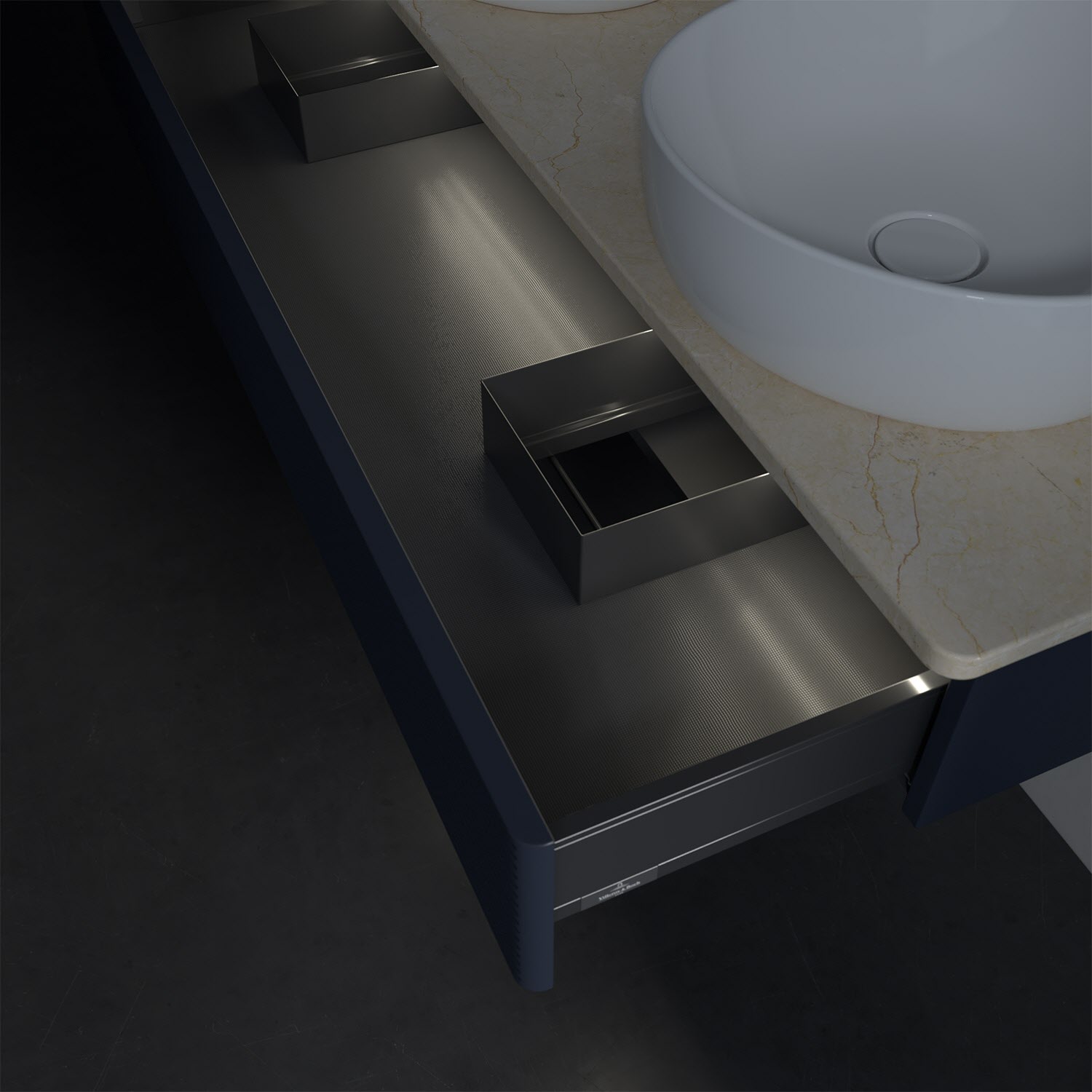 Der wandhängende Antao Waschtischunterschrank von Villeroy & Boch bietet nicht nur jede Menge Stauraum – er ist dank seines naturinspirierten Designs mit seinen abgerundeten Kanten auch noch besonders stilvoll und schafft eine gemütliche Atmosphäre im Badezimmer. Kombiniert mit zwei passenden Aufsatzwaschtischen also die ideale Wahl. Der geräumige Auszug bietet viel Platz, um alles Notwendige zu verstauen und Ordnung zu halten. Öffnen lässt er sich durch leichten Druck auf die strukturierte Front. Dabei aktiviert sich übrigens die Auszugsbeleuchtung in angenehmem Warmweiß. Dank Vollauszug hat man immer alles im Blick und der Antirutschboden verhindert ein Umfallen oder Verrutschen der Gegenstände. Einfach clever! Für eine besonders leichte Pflege sorgt die mehrschichtig deckend lackierte Oberfläche. Bei der Ausführung in Massivholz wird dank des verarbeiteten Massivholzes jedes Möbel zu einem Unikat, das sich durch das lebendige Naturmaterial durch seine einzigartige Struktur und Maserung auszeichnet.