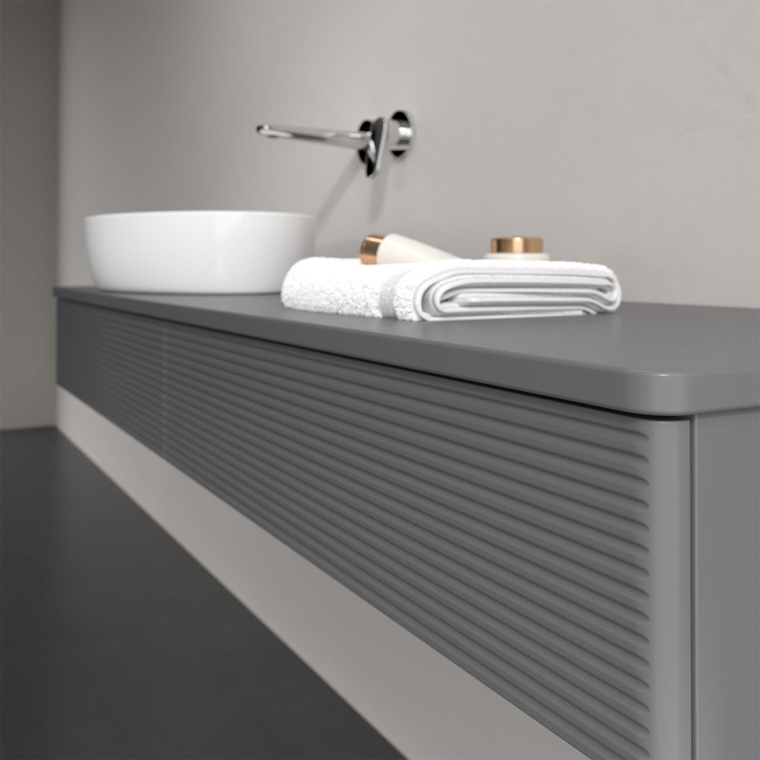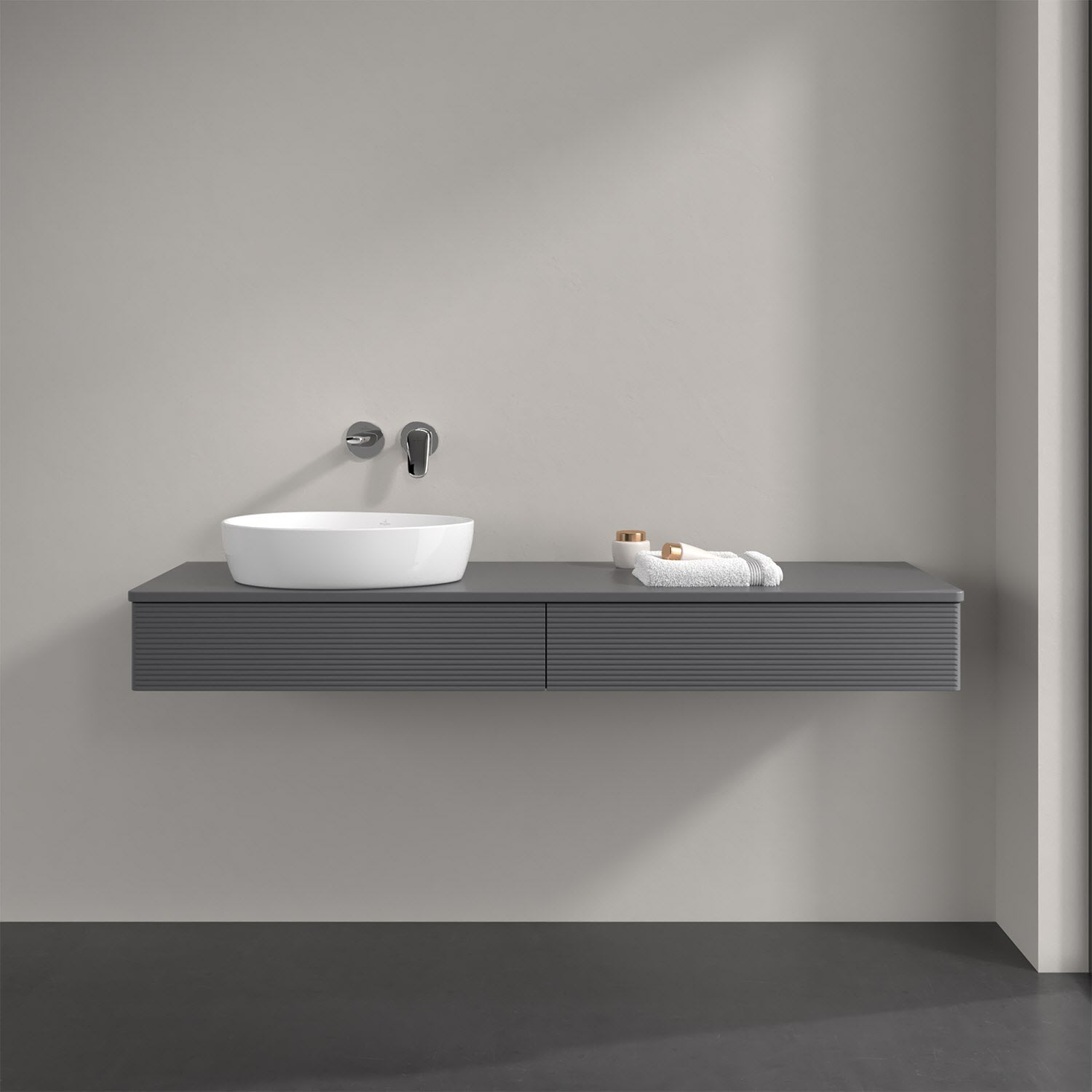 Villeroy & Boch Antao Waschbeckenunterschrank, 160 x 19 cm, 2 Auszüge mit LED-Licht, Front mit Struktur, mit Hahnloch, für Waschtisch links