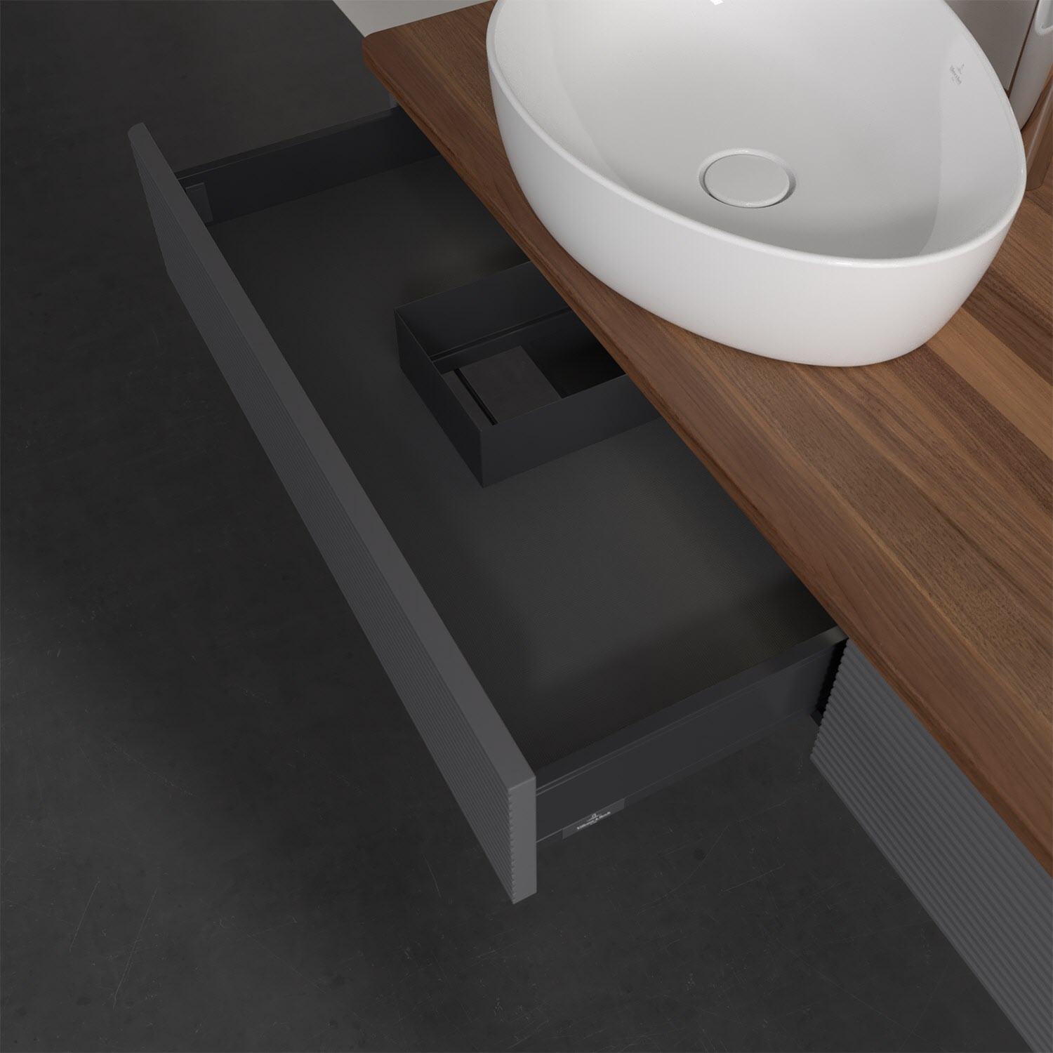 Villeroy & Boch Antao Waschbeckenunterschrank, 160 x 19 cm, 2 Auszüge mit LED-Licht, Front mit Struktur, mit Hahnloch, für Waschtisch links