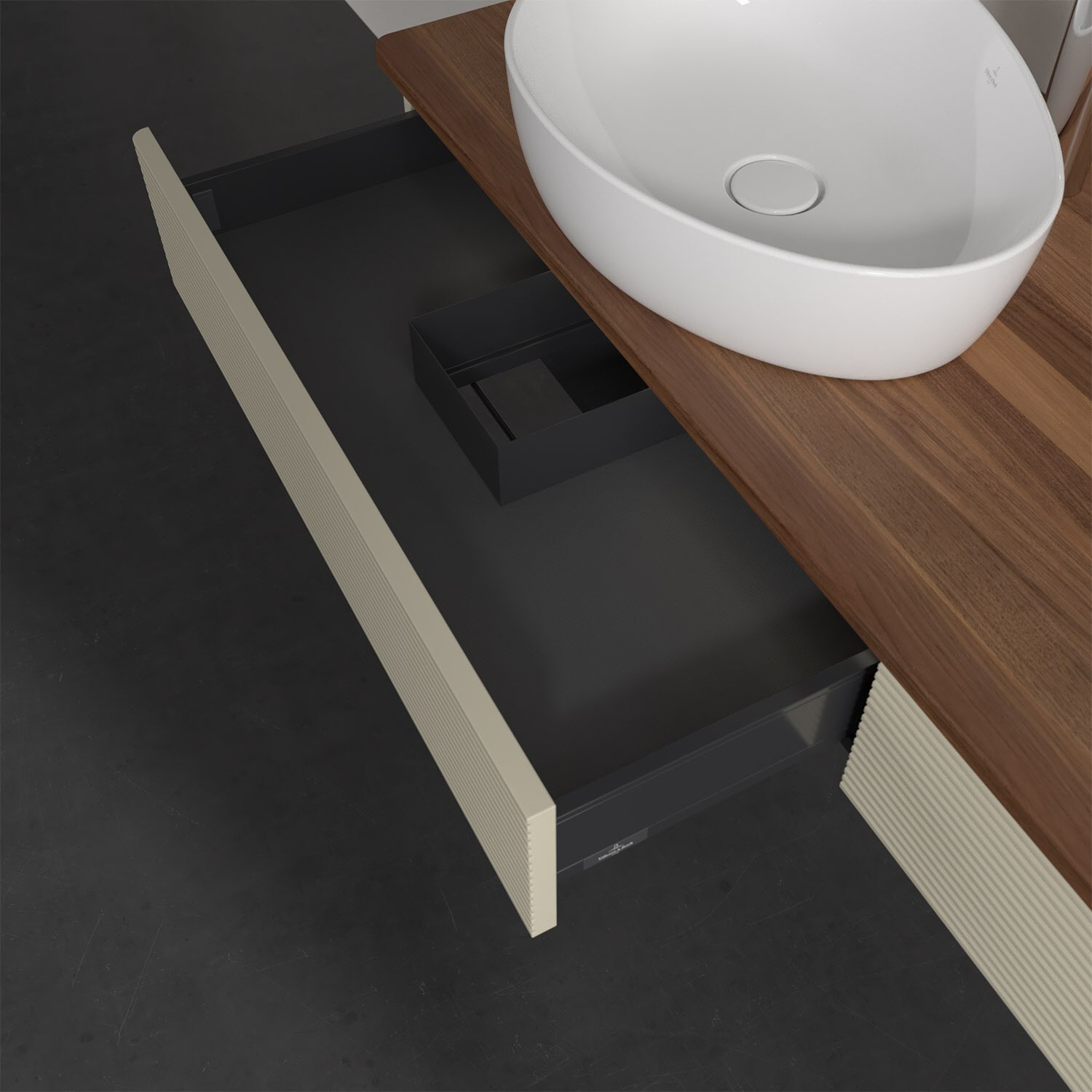 Für diesen Waschbeckenunterschrank stehen Ihnen Aufsatzwaschtische aus verschiedenen Serien zur Verfügung (siehe "Passliste" unter Downloads). Ein ausgewähltes Beispiel finden Sie im Zubehör. Den Waschtisch bitte separat mitbestellen.