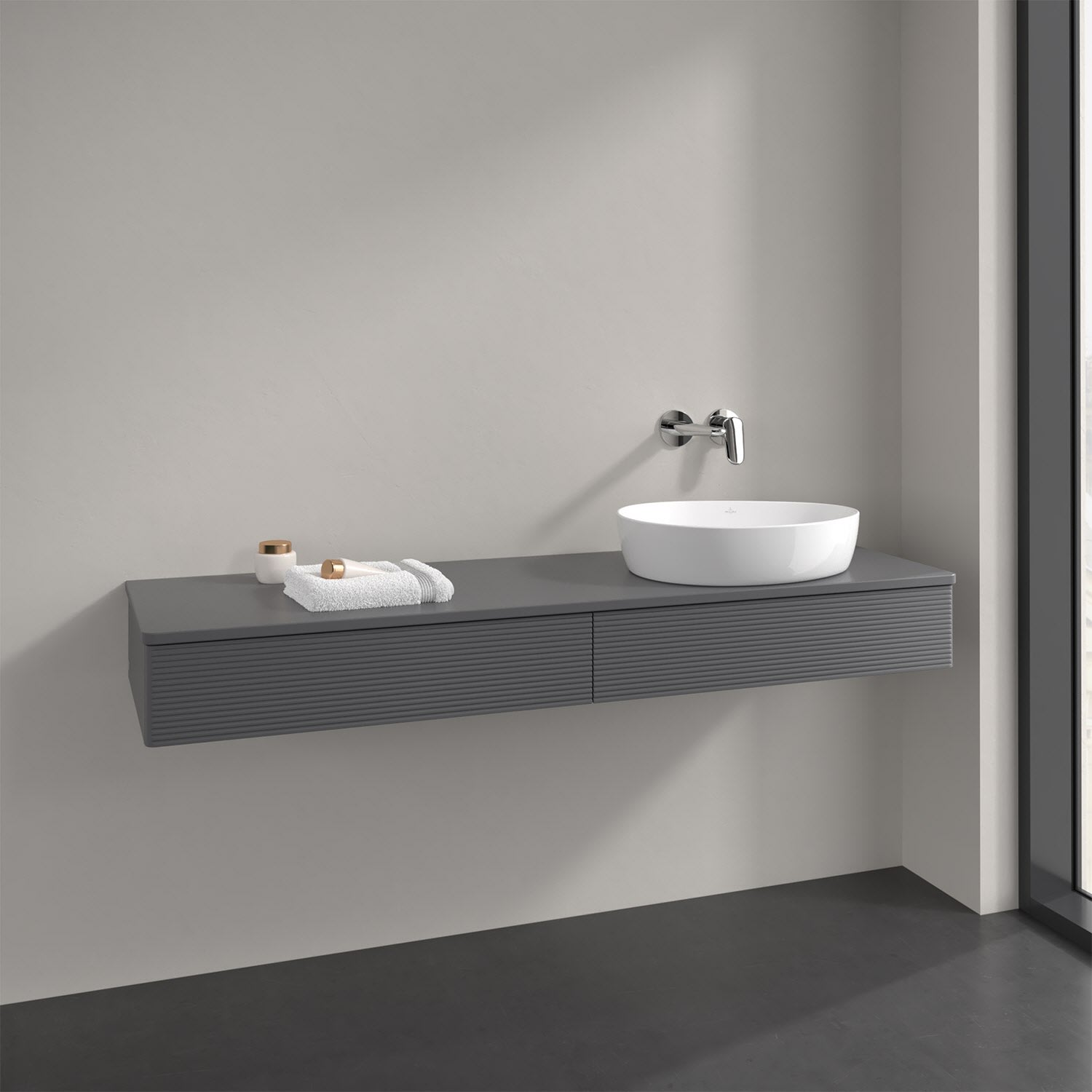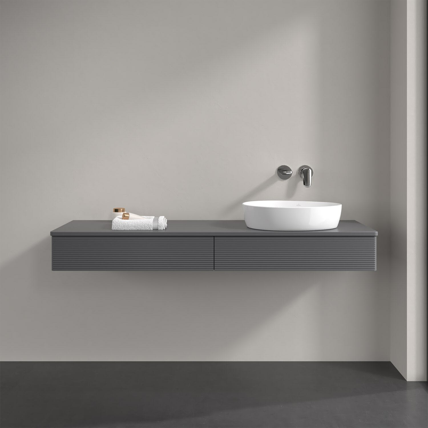 Villeroy & Boch Antao Waschbeckenunterschrank, 160 x 19 cm, 2 Auszüge mit LED-Licht, Front mit Struktur, mit Hahnloch, für Waschtisch rechts
