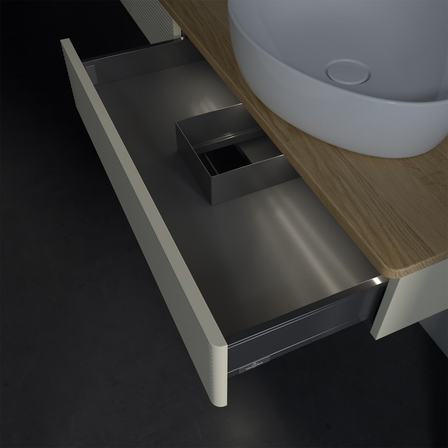 Der wandhängende Antao Waschtischunterschrank bietet mit seinen beiden Auszügen und seiner erstaunlichen Größe viel Platz zum Verstauen von Utensilien im Badezimmer. Dank des seitlich platzierten Aufsatzwaschtischs gibt es daneben weiteren Platz für Handtücher, Seifenspender & Co. auf der Waschtischplatte. Inspiriert von der Natur überzeugt der Unterschrank auch optisch mit sanfter Formsprache und abgerundete Kanten. Die grifflosen Auszüge mit strukturierter Front sind mit der Push-to-Open Funktion ausgestattet und verfügen über einen Antirutschboden, damit Utensilien sicher verstaut werden können. Den Überblick behält man dank der warmweißen Auszugsbeleuchtung, die sich automatisch beim Öffnen einschaltet. Mit seiner Vollauszug- und Selbsteinzug-Funktion ist der Schrank einfach praktisch und leicht zu bedienen. Qualität von Villeroy & Boch! Für eine besonders leichte Pflege sorgt die mehrschichtig deckend lackierte Oberfläche. Bei der Ausführung in Massivholz wird dank des verarbeiteten Massivholzes jedes Möbel zu einem Unikat, das sich durch das lebendige Naturmaterial durch seine einzigartige Struktur und Maserung auszeichnet.