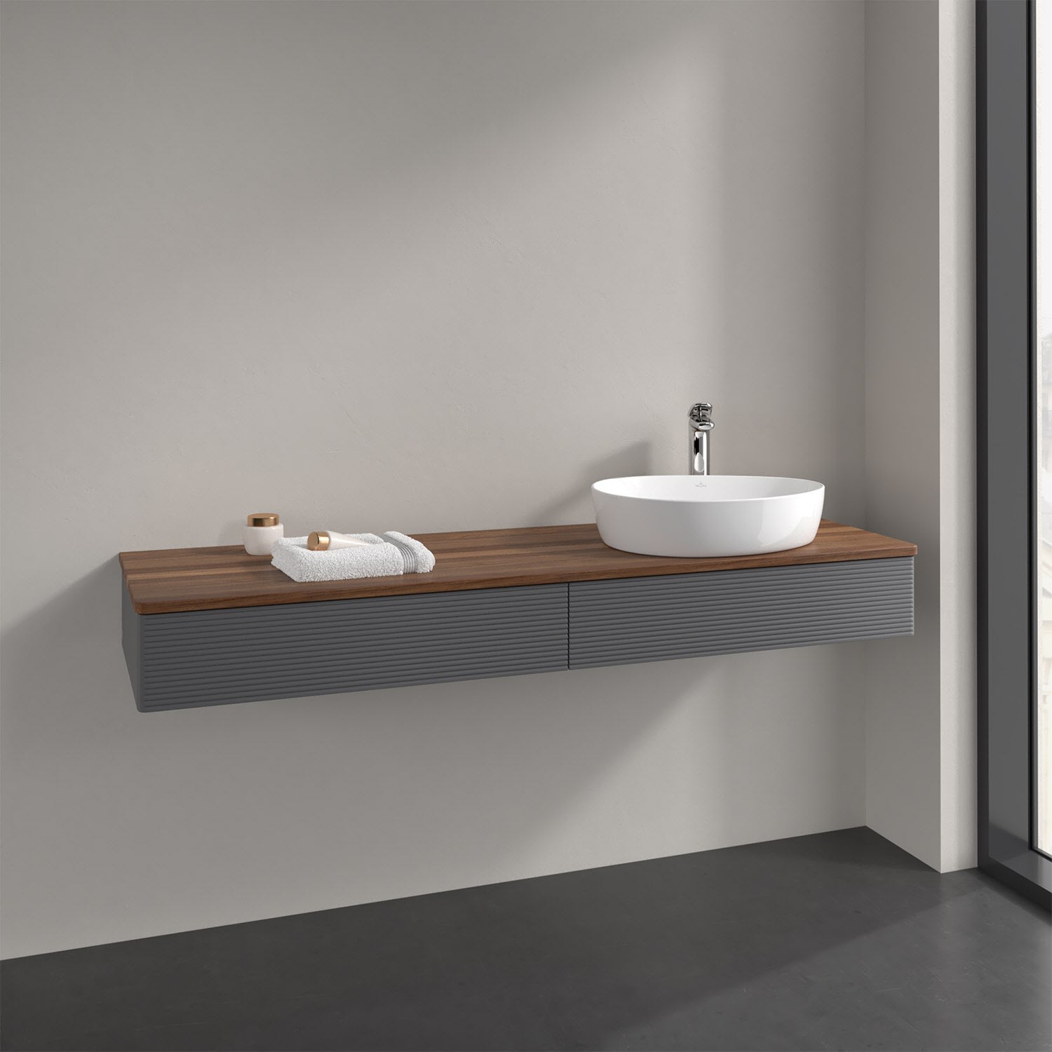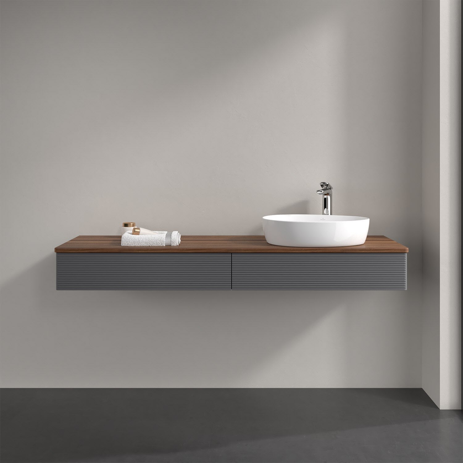 Villeroy & Boch Antao Waschbeckenunterschrank, 160 x 19 cm, 2 Auszüge mit LED-Licht, Front mit Struktur, mit Hahnloch, für Waschtisch rechts