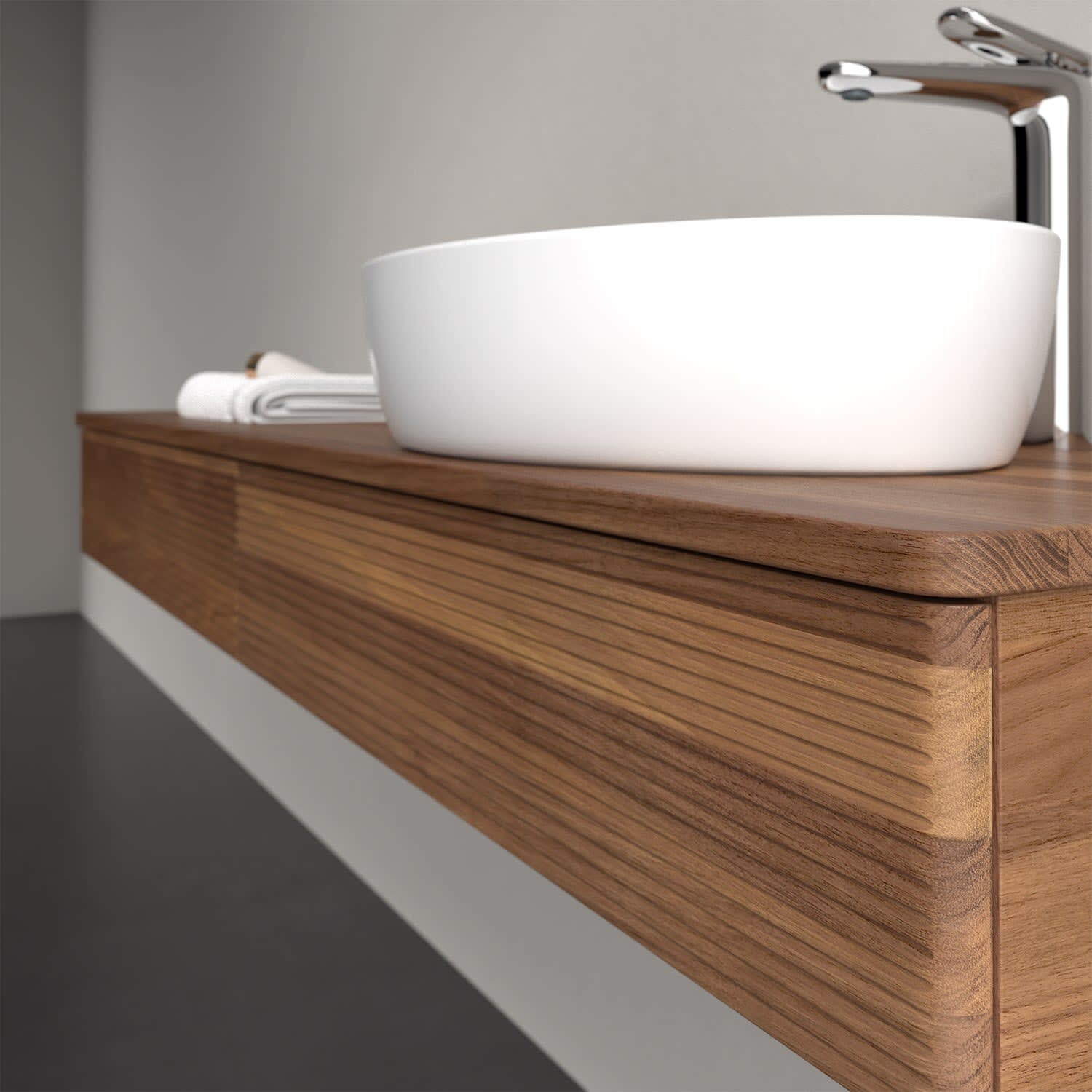 Der wandhängende Antao Waschtischunterschrank bietet mit seinen beiden Auszügen und seiner erstaunlichen Größe viel Platz zum Verstauen von Utensilien im Badezimmer. Dank des seitlich platzierten Aufsatzwaschtischs gibt es daneben weiteren Platz für Handtücher, Seifenspender & Co. auf der Waschtischplatte. Inspiriert von der Natur überzeugt der Unterschrank auch optisch mit sanfter Formsprache und abgerundete Kanten. Die grifflosen Auszüge mit strukturierter Front sind mit der Push-to-Open Funktion ausgestattet und verfügen über einen Antirutschboden, damit Utensilien sicher verstaut werden können. Den Überblick behält man dank der warmweißen Auszugsbeleuchtung, die sich automatisch beim Öffnen einschaltet. Mit seiner Vollauszug- und Selbsteinzug-Funktion ist der Schrank einfach praktisch und leicht zu bedienen. Qualität von Villeroy & Boch! Für eine besonders leichte Pflege sorgt die mehrschichtig deckend lackierte Oberfläche. Bei der Ausführung in Massivholz wird dank des verarbeiteten Massivholzes jedes Möbel zu einem Unikat, das sich durch das lebendige Naturmaterial durch seine einzigartige Struktur und Maserung auszeichnet.