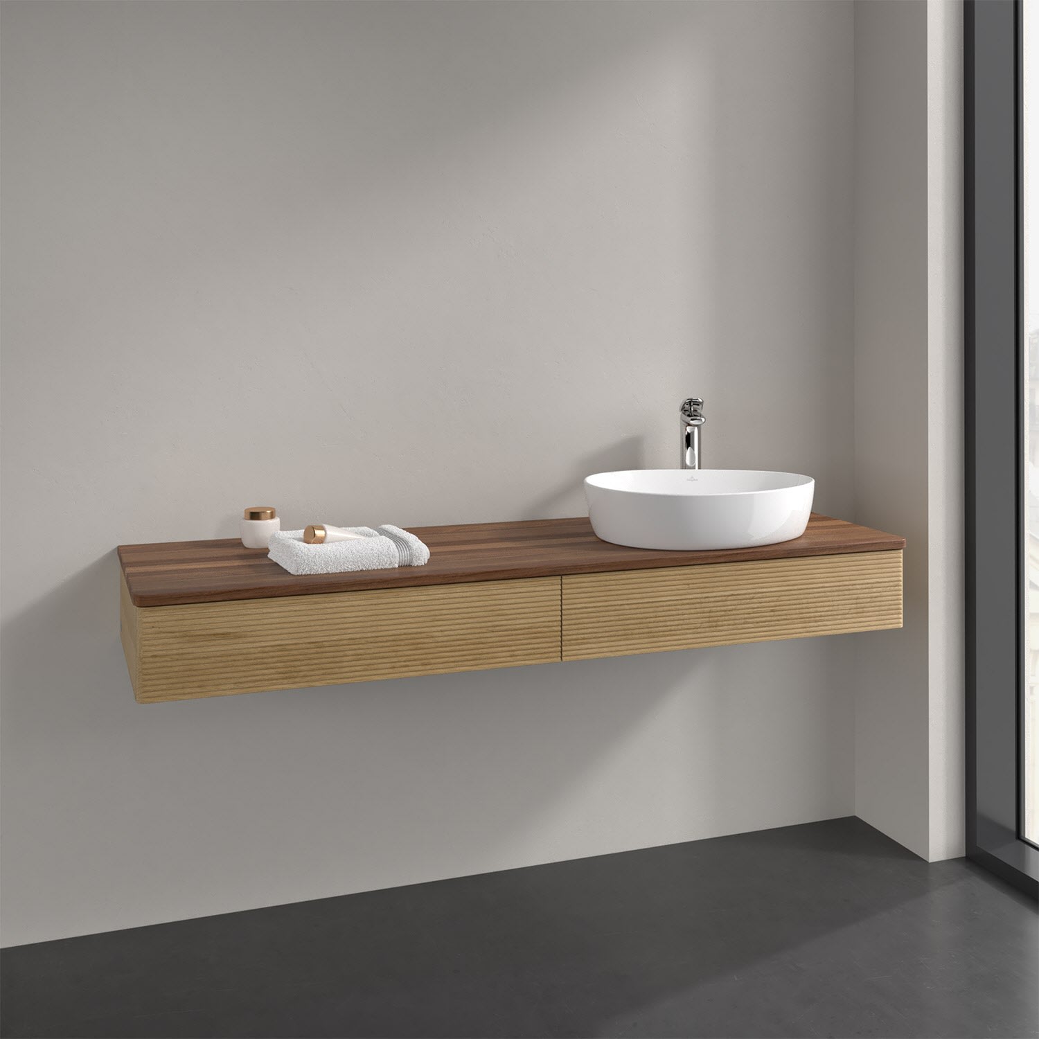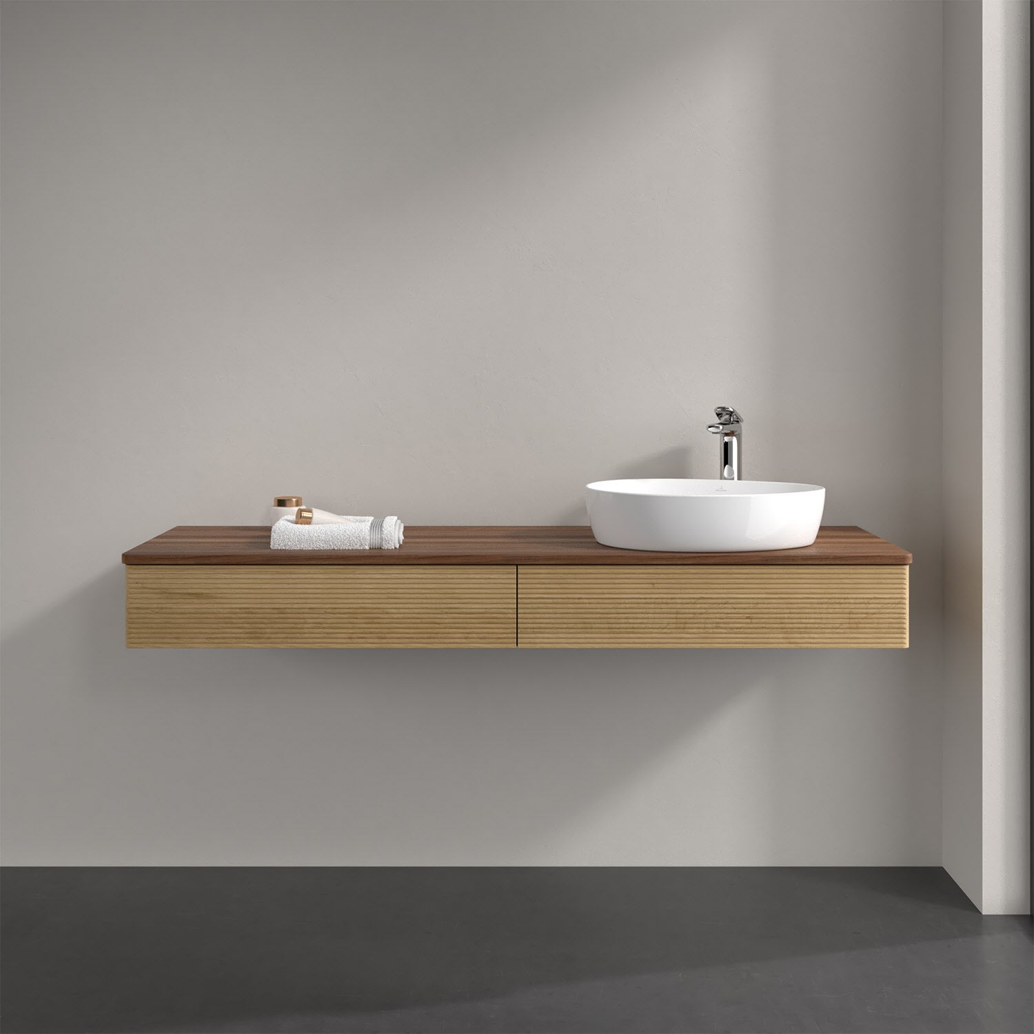 Villeroy & Boch Antao Waschbeckenunterschrank, 160 x 19 cm, 2 Auszüge mit LED-Licht, Front mit Struktur, mit Hahnloch, für Waschtisch rechts