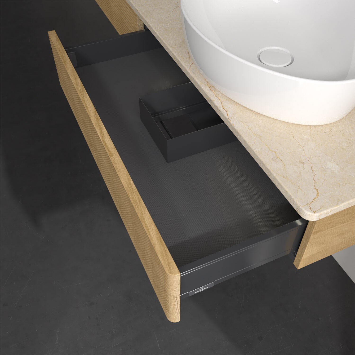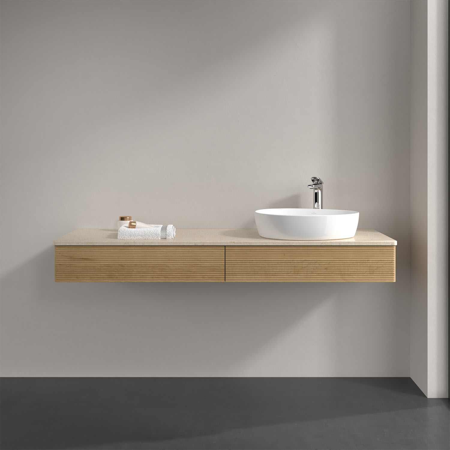 Villeroy & Boch Antao Waschbeckenunterschrank, 160 x 19 cm, 2 Auszüge mit LED-Licht, Front mit Struktur, mit Hahnloch, für Waschtisch rechts
