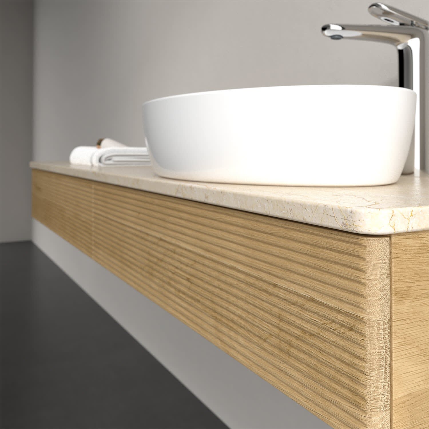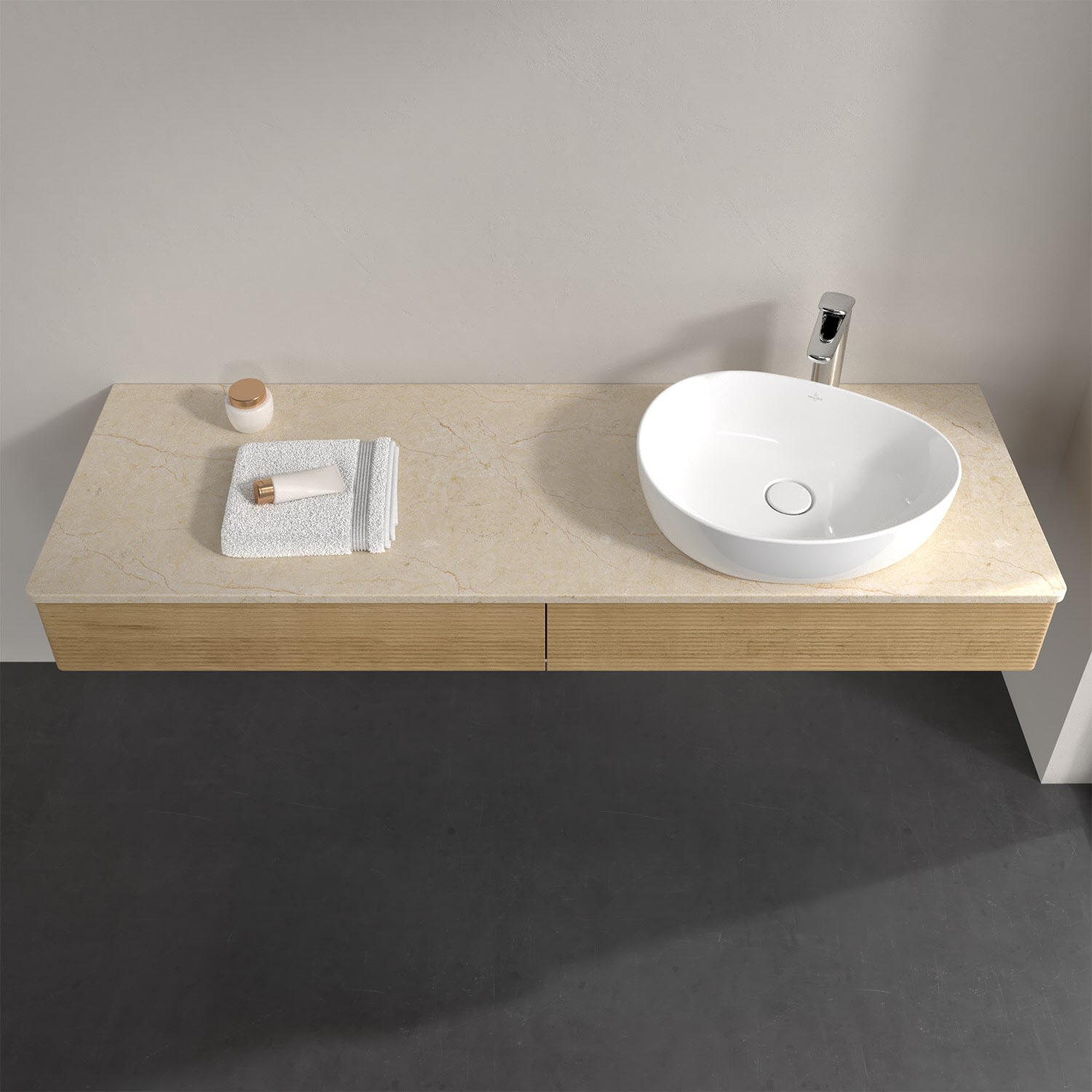 Für diesen Waschbeckenunterschrank stehen Ihnen Aufsatzwaschtische aus verschiedenen Serien zur Verfügung (siehe "Passliste" unter Downloads). Ein ausgewähltes Beispiel finden Sie im Zubehör. Den Waschtisch bitte separat mitbestellen.