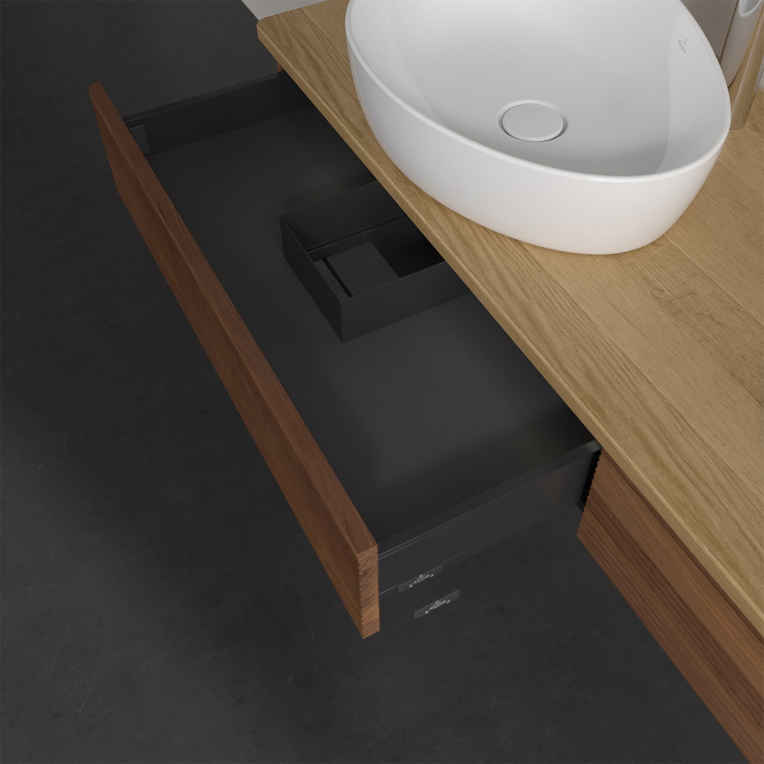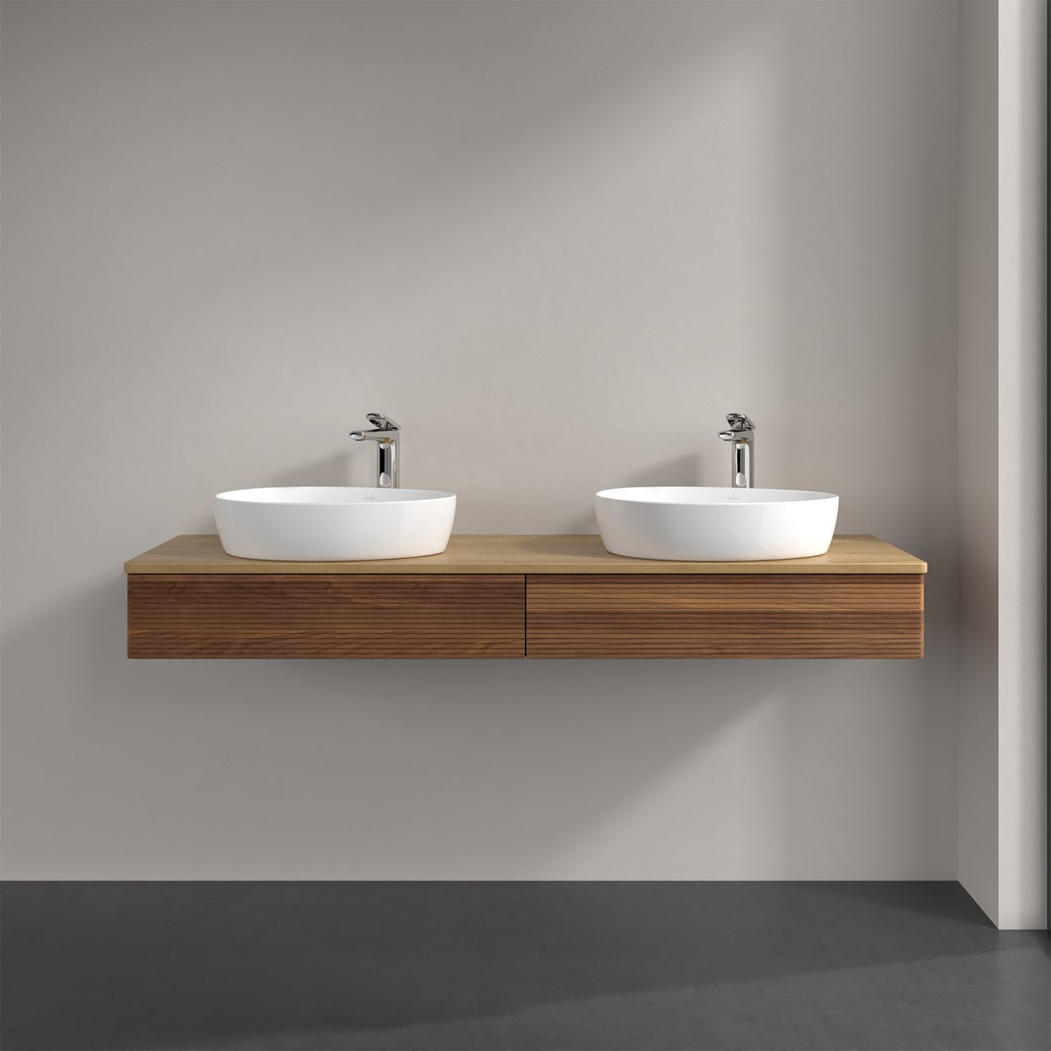 Villeroy & Boch Antao Waschbeckenunterschrank, 160 x 19 cm, 2 Auszüge mit LED-Licht, Front mit Struktur, mit Hahnloch, für Waschtisch links und rechts