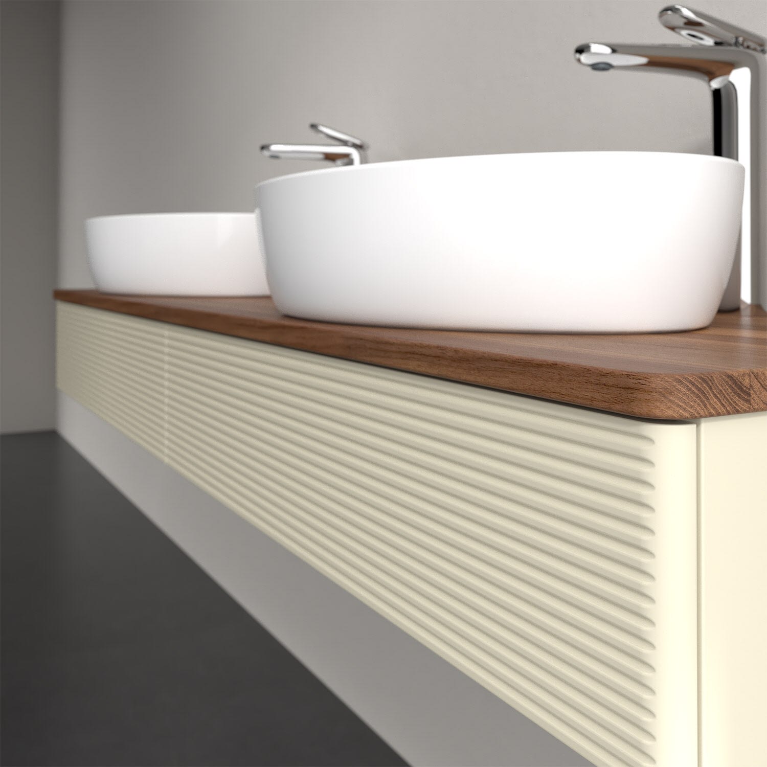 Der wandhängende Antao Waschtischunterschrank für zwei Aufsatzwaschtische bietet mit seinen beiden Auszügen und seiner erstaunlichen Größe viel Platz zum Verstauen von Utensilien im Badezimmer. Inspiriert von der Natur überzeugt der Unterschrank auch optisch mit sanfter Formsprache und abgerundete Kanten. Die grifflosen Auszüge mit strukturierter Front sind mit der Push-to-Open Funktion ausgestattet und verfügen über einen Antirutschboden, damit Utensilien sicher verstaut werden können. Den Überblick behält man dank der warmweißen Auszugsbeleuchtung, die sich automatisch beim Öffnen einschaltet. Mit seiner Vollauszug- und Selbsteinzug-Funktion ist der Schrank einfach praktisch und leicht zu bedienen. Qualität von Villeroy & Boch! Für eine besonders leichte Pflege sorgt die mehrschichtig deckend lackierte Oberfläche. Bei der Ausführung in Massivholz wird dank des verarbeiteten Massivholzes jedes Möbel zu einem Unikat, das sich durch das lebendige Naturmaterial durch seine einzigartige Struktur und Maserung auszeichnet.