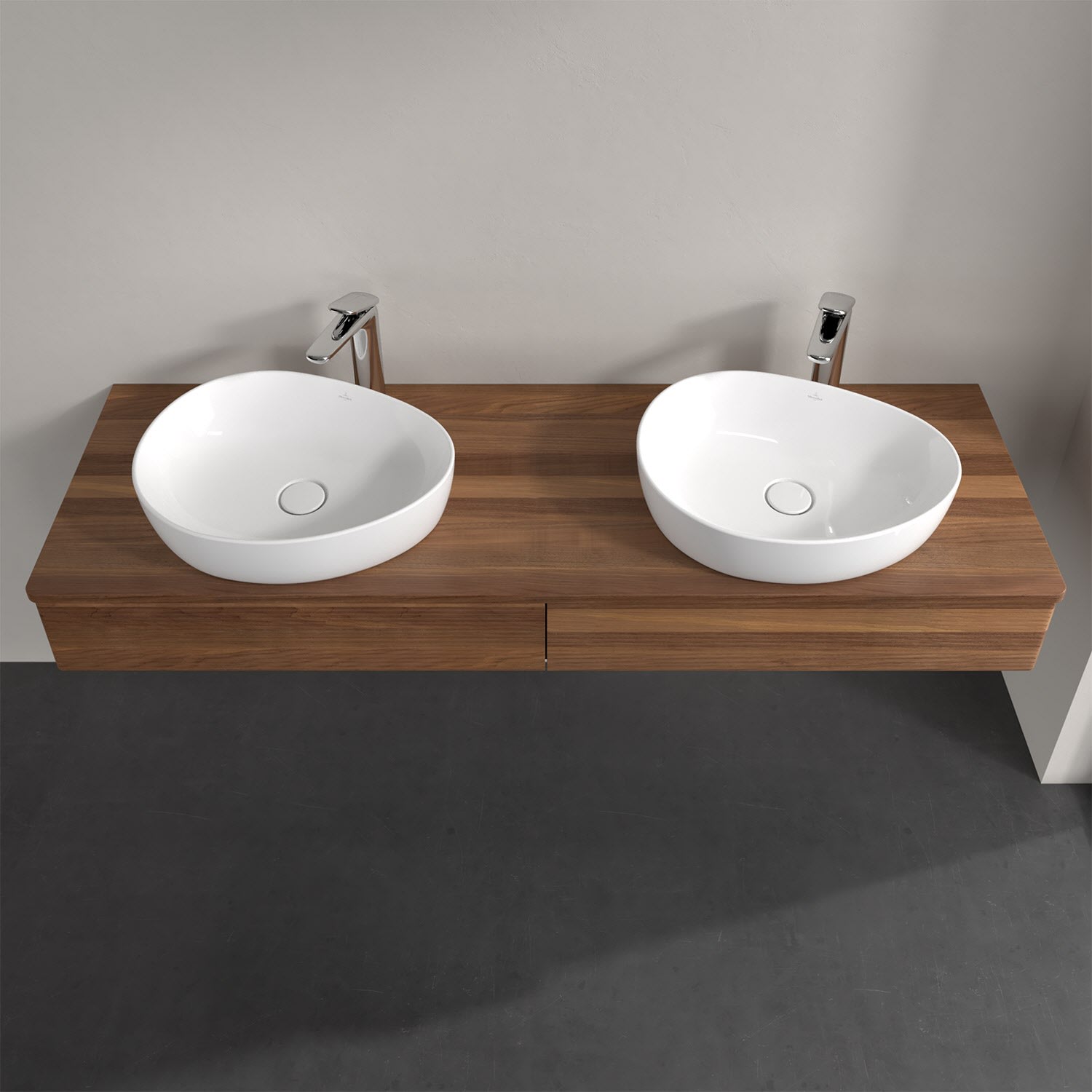 Der wandhängende Antao Waschtischunterschrank für zwei Aufsatzwaschtische bietet mit seinen beiden Auszügen und seiner erstaunlichen Größe viel Platz zum Verstauen von Utensilien im Badezimmer. Inspiriert von der Natur überzeugt der Unterschrank auch optisch mit sanfter Formsprache und abgerundete Kanten. Die grifflosen Auszüge mit strukturierter Front sind mit der Push-to-Open Funktion ausgestattet und verfügen über einen Antirutschboden, damit Utensilien sicher verstaut werden können. Den Überblick behält man dank der warmweißen Auszugsbeleuchtung, die sich automatisch beim Öffnen einschaltet. Mit seiner Vollauszug- und Selbsteinzug-Funktion ist der Schrank einfach praktisch und leicht zu bedienen. Qualität von Villeroy & Boch! Für eine besonders leichte Pflege sorgt die mehrschichtig deckend lackierte Oberfläche. Bei der Ausführung in Massivholz wird dank des verarbeiteten Massivholzes jedes Möbel zu einem Unikat, das sich durch das lebendige Naturmaterial durch seine einzigartige Struktur und Maserung auszeichnet.