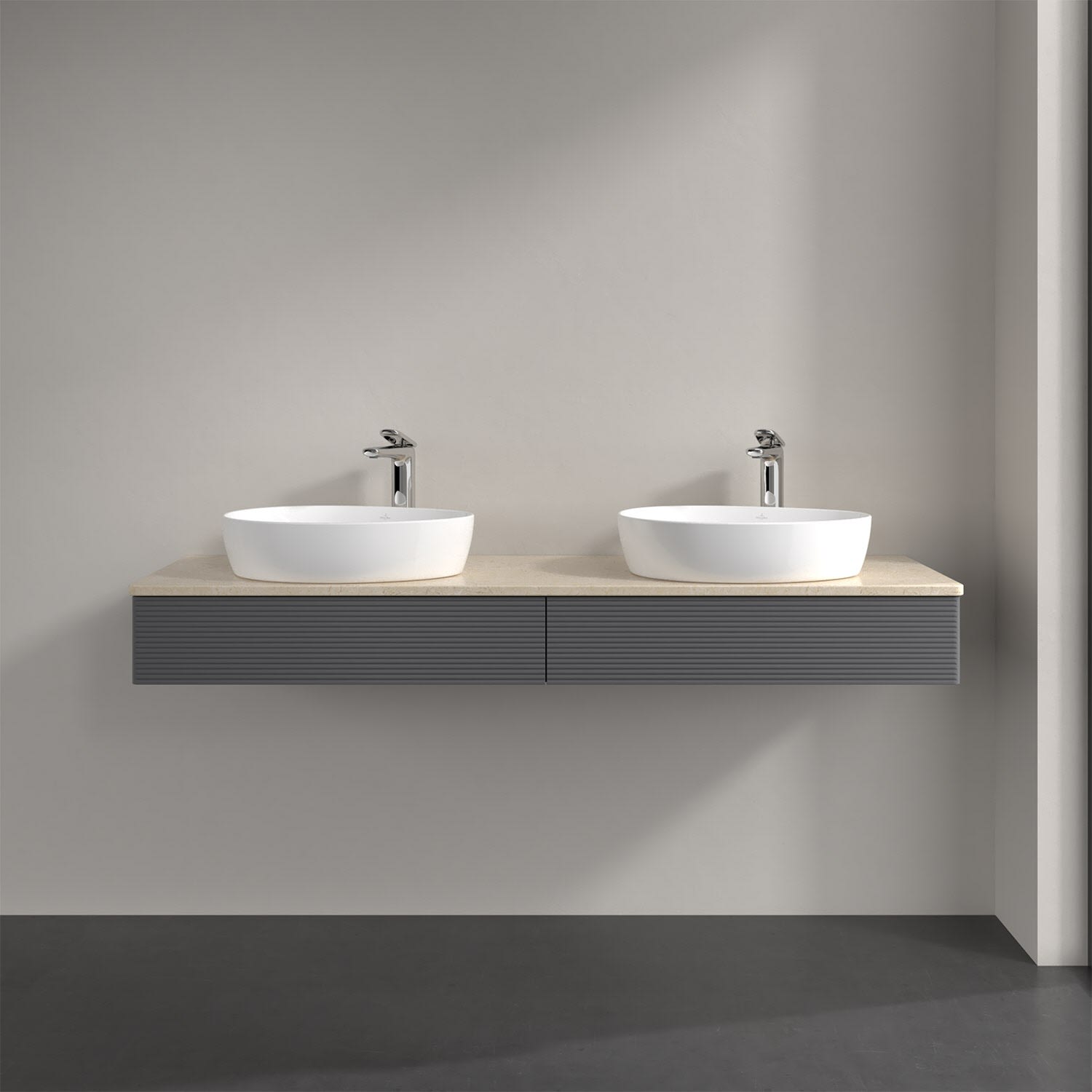 Villeroy & Boch Antao Waschbeckenunterschrank, 160 x 19 cm, 2 Auszüge mit LED-Licht, Front mit Struktur, mit Hahnloch, für Waschtisch links und rechts
