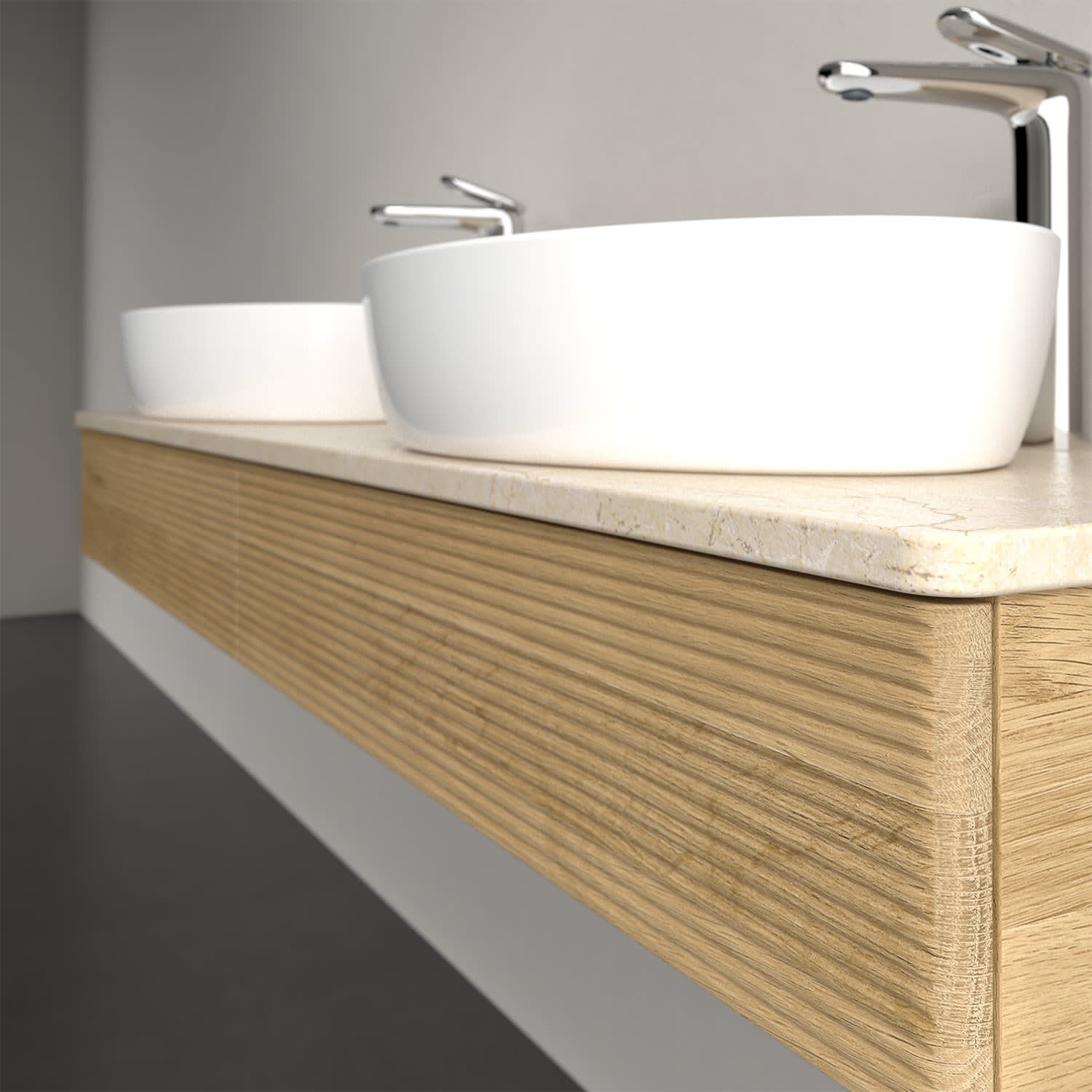 Der wandhängende Antao Waschtischunterschrank für zwei Aufsatzwaschtische bietet mit seinen beiden Auszügen und seiner erstaunlichen Größe viel Platz zum Verstauen von Utensilien im Badezimmer. Inspiriert von der Natur überzeugt der Unterschrank auch optisch mit sanfter Formsprache und abgerundete Kanten. Die grifflosen Auszüge mit strukturierter Front sind mit der Push-to-Open Funktion ausgestattet und verfügen über einen Antirutschboden, damit Utensilien sicher verstaut werden können. Den Überblick behält man dank der warmweißen Auszugsbeleuchtung, die sich automatisch beim Öffnen einschaltet. Mit seiner Vollauszug- und Selbsteinzug-Funktion ist der Schrank einfach praktisch und leicht zu bedienen. Qualität von Villeroy & Boch! Für eine besonders leichte Pflege sorgt die mehrschichtig deckend lackierte Oberfläche. Bei der Ausführung in Massivholz wird dank des verarbeiteten Massivholzes jedes Möbel zu einem Unikat, das sich durch das lebendige Naturmaterial durch seine einzigartige Struktur und Maserung auszeichnet.