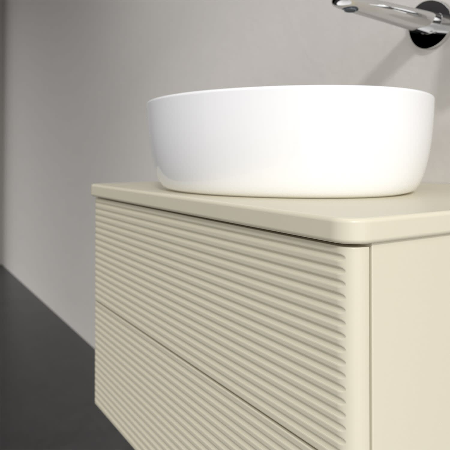 Für diesen Waschbeckenunterschrank stehen Ihnen Aufsatzwaschtische aus verschiedenen Serien zur Verfügung (siehe "Passliste" unter Downloads). Ein ausgewähltes Beispiel finden Sie im Zubehör. Den Waschtisch bitte separat mitbestellen.