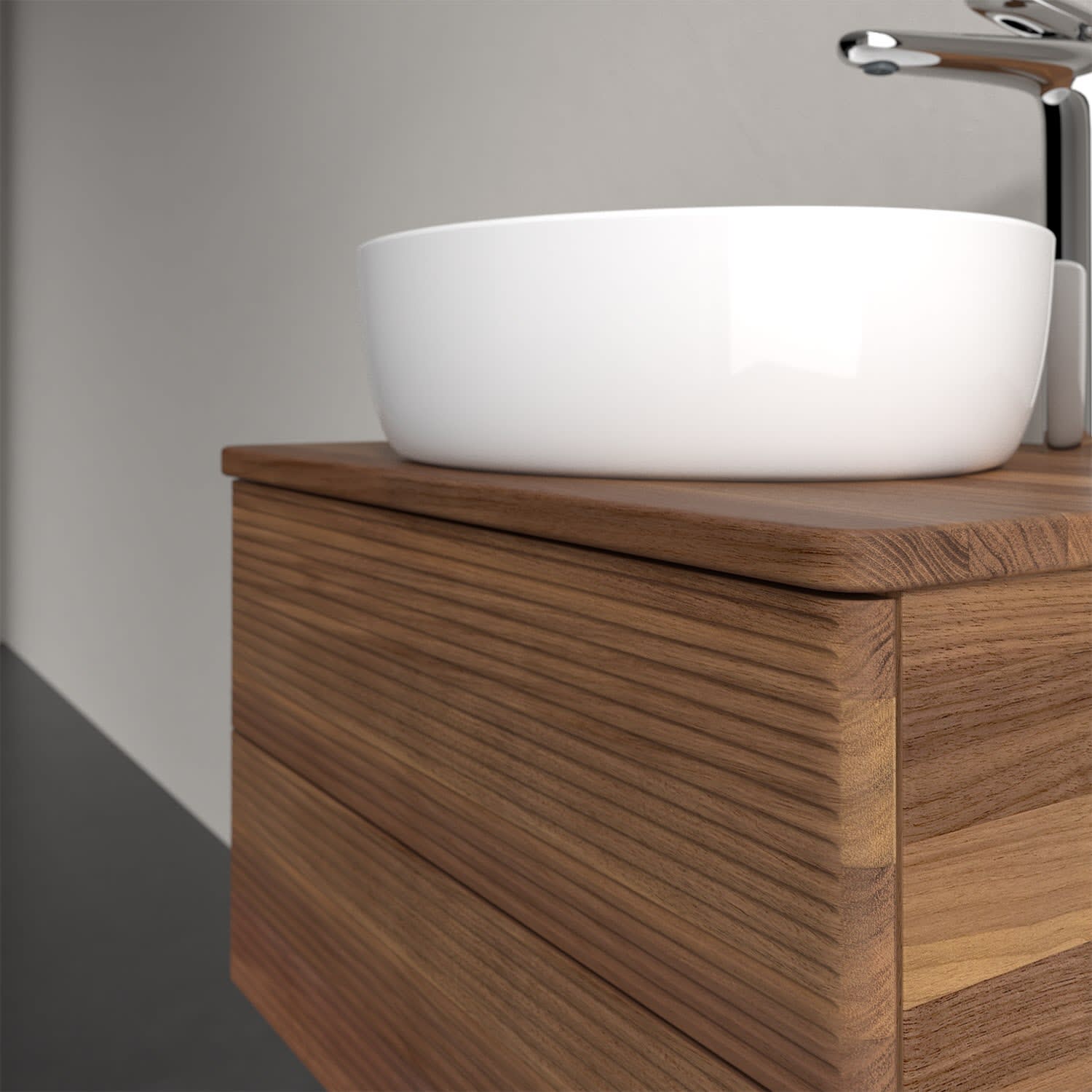 Wenig Platz im Badezimmer und dennoch soll es gemütlich und ordentlich sein? Dann ist der wandhängende Antao Waschtischunterschrank mit seinen sanft abgerundeten Kanten die ideale Lösung. Das geräumige Möbel bietet ausreichend Stauraum für alle nötigen Badutensilien. Zum Öffnen genügt dank der Push-to-Open Funktion ein leichter Druck auf die beiden Auszüge mit strukturierter Front, die sich dann in ihrer vollen Tiefe öffnen. Dabei wird gleichzeitig die angenehme Auszugsbeleuchtung in Warmweiß aktiviert. Das garantiert den benötigen Überblick! Praktisch ist auch der integrierte Antirutschboden und die SoftClosing Funktion, die ein Umfallen oder Verrutschen der verstauten Produkte verhindern. Villeroy & Boch hat alles durchdacht! Für eine besonders leichte Pflege sorgt die mehrschichtig deckend lackierte Oberfläche. Bei der Ausführung in Massivholz wird dank des verarbeiteten Massivholzes jedes Möbel zu einem Unikat, das sich durch das lebendige Naturmaterial durch seine einzigartige Struktur und Maserung auszeichnet.