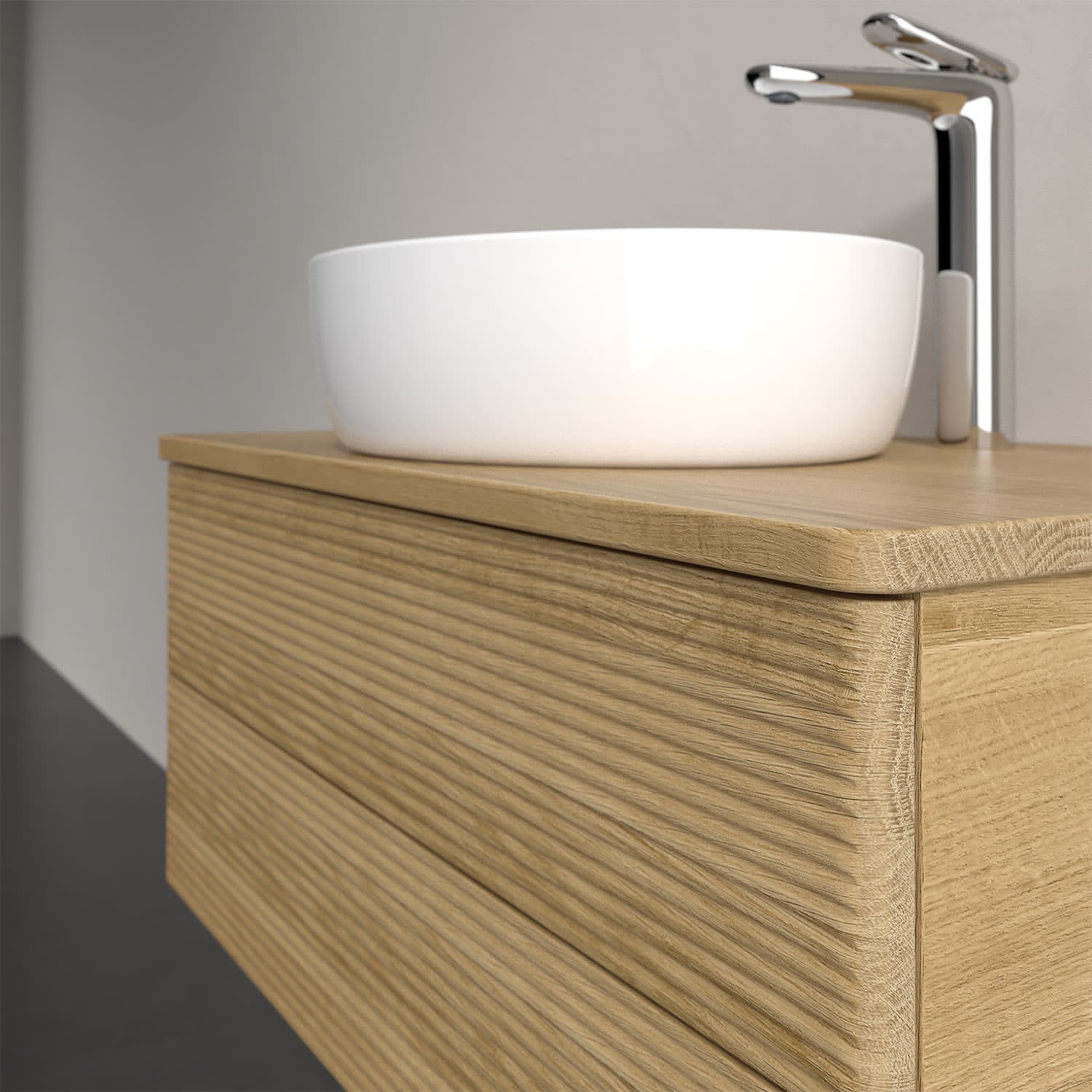 Mit dem wandhängenden Waschtischunterschrank der Kollektion Antao wird ein natürliches und gemütliches Flair am Waschplatz geschaffen. Dafür sorgen die sanfte Formsprache mit abgerundeten Kanten und die strukturierte Front des hochwertigen Badmöbels. Die wichtigsten Badutensilien für die tägliche Routine können seitlich des Waschtischs auf die Waschtischplatte gestellt werden. Ansonsten bieten zwei Auszüge inklusive warmweißer Beleuchtung und Antirutschboden ausreichend Platz für weitere Produkte, die garantiert bleiben, wo sie hingehören. Der Unterschrank verfügt zudem über einen Vollauszug und Selbsteinzug mit SoftClosing Funktion, damit er bequem und mühelos geöffnet und geschlossen werden kann. Gewohnte Qualität von Villeroy & Boch! Für eine besonders leichte Pflege sorgt die mehrschichtig deckend lackierte Oberfläche. Bei der Ausführung in Massivholz wird dank des verarbeiteten Massivholzes jedes Möbel zu einem Unikat, das sich durch das lebendige Naturmaterial durch seine einzigartige Struktur und Maserung auszeichnet.