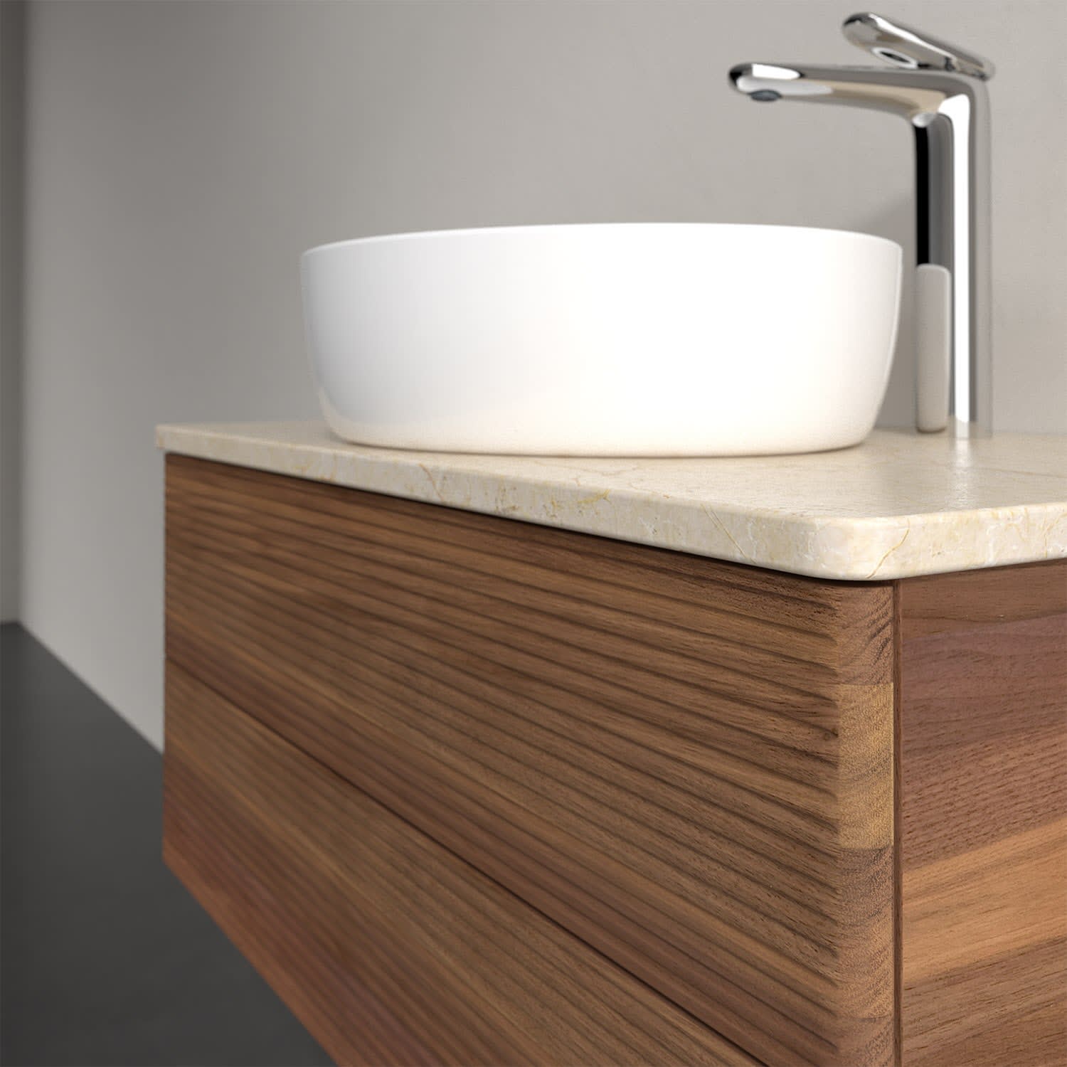Mit dem wandhängenden Waschtischunterschrank der Kollektion Antao wird ein natürliches und gemütliches Flair am Waschplatz geschaffen. Dafür sorgen die sanfte Formsprache mit abgerundeten Kanten und die strukturierte Front des hochwertigen Badmöbels. Die wichtigsten Badutensilien für die tägliche Routine können seitlich des Waschtischs auf die Waschtischplatte gestellt werden. Ansonsten bieten zwei Auszüge inklusive warmweißer Beleuchtung und Antirutschboden ausreichend Platz für weitere Produkte, die garantiert bleiben, wo sie hingehören. Der Unterschrank verfügt zudem über einen Vollauszug und Selbsteinzug mit SoftClosing Funktion, damit er bequem und mühelos geöffnet und geschlossen werden kann. Gewohnte Qualität von Villeroy & Boch! Für eine besonders leichte Pflege sorgt die mehrschichtig deckend lackierte Oberfläche. Bei der Ausführung in Massivholz wird dank des verarbeiteten Massivholzes jedes Möbel zu einem Unikat, das sich durch das lebendige Naturmaterial durch seine einzigartige Struktur und Maserung auszeichnet.
