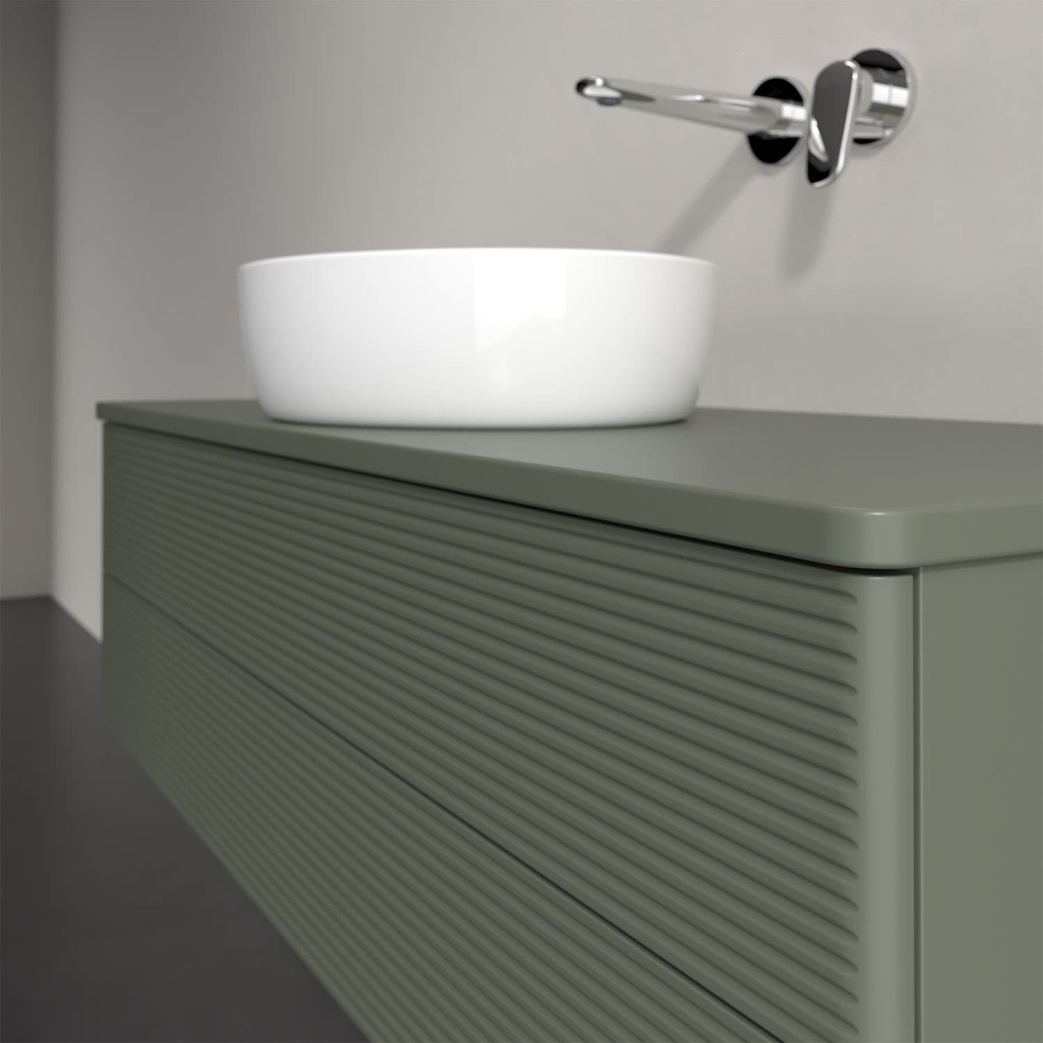 Der wandhängende Antao Waschtischunterschrank von Villeroy & Boch bietet nicht nur jede Menge Stauraum – er ist dank seines naturinspirierten Designs mit seinen abgerundeten Kanten auch noch besonders stilvoll und schafft eine gemütliche Atmosphäre im Badezimmer. Auf der Waschtischplatte bietet sich rechts und links neben dem Waschtisch viel Platz für Zahnbürstenbecher oder Seifenspender. Zwei geräumige Auszüge bieten viel Platz, um alles Notwendige zu verstauen und Ordnung zu halten. Öffnen lassen sie sich durch leichten Druck auf die strukturierte Front. Dabei aktiviert sich übrigens die Auszugsbeleuchtung in angenehmem Warmweiß. Dank Vollauszug hat man immer alles im Blick und der Antirutschboden verhindert ein Umfallen oder Verrutschen der Gegenstände. Einfach clever! Für eine besonders leichte Pflege sorgt die mehrschichtig deckend lackierte Oberfläche.