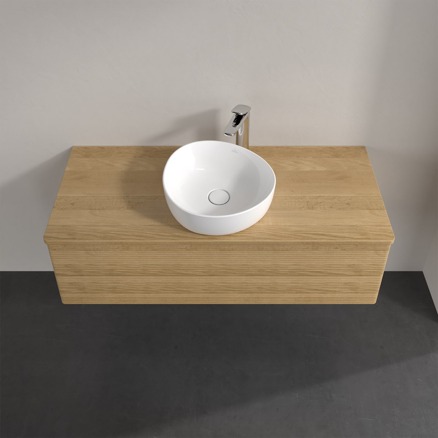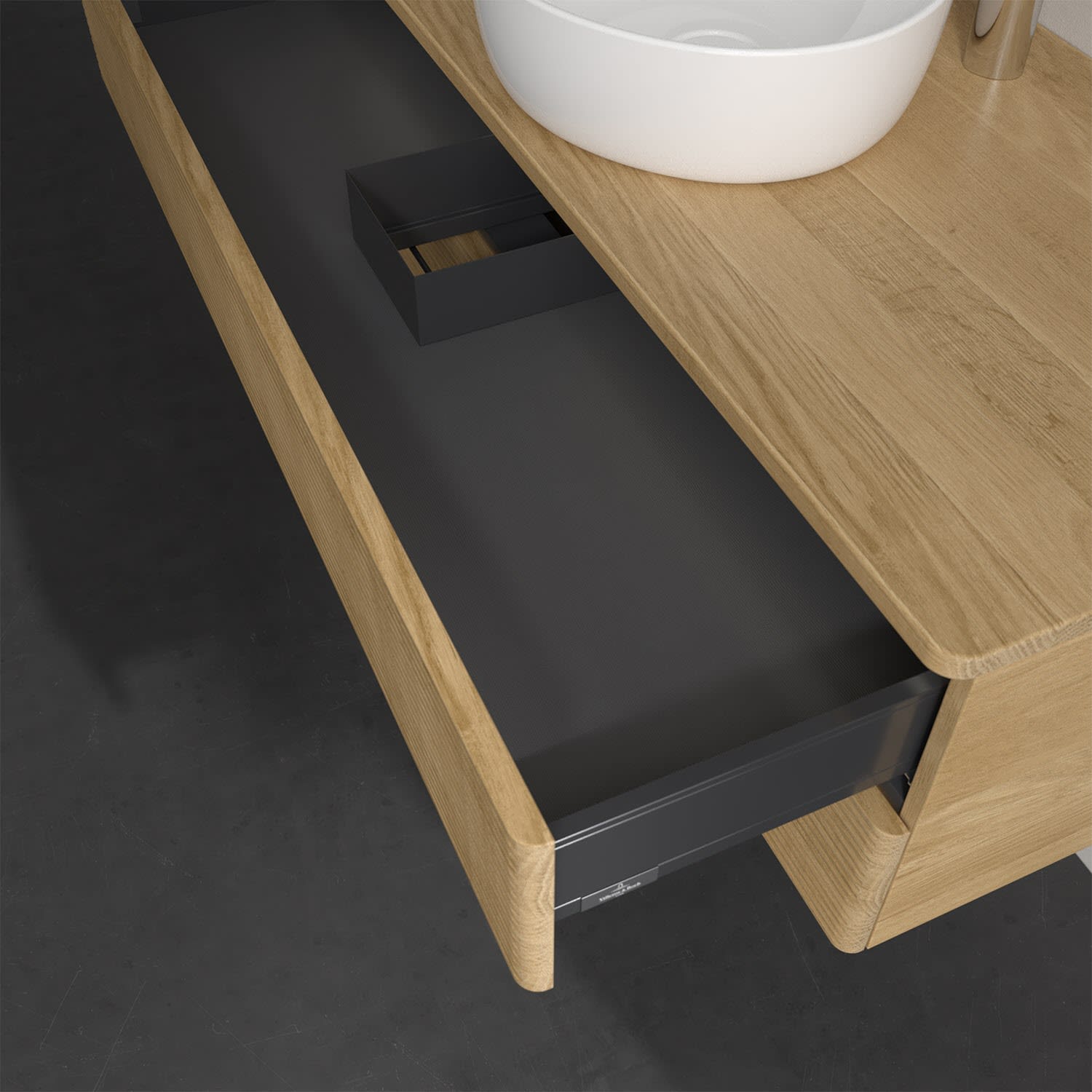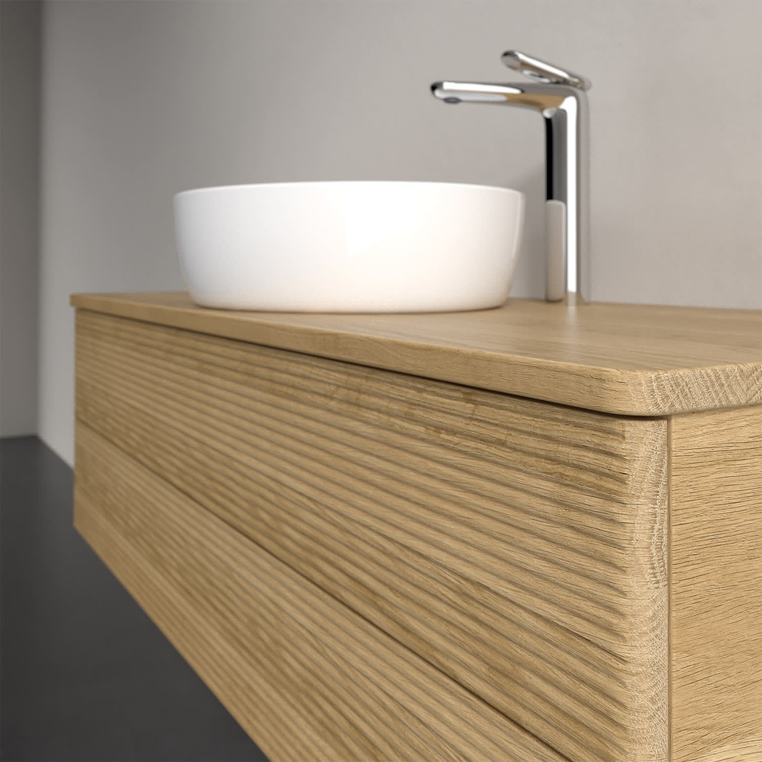 Der wandhängende Antao Waschtischunterschrank von Villeroy & Boch bietet nicht nur jede Menge Stauraum – er ist dank seines naturinspirierten Designs mit seinen abgerundeten Kanten auch noch besonders stilvoll und schafft eine gemütliche Atmosphäre im Badezimmer. Auf der Waschtischplatte bietet sich rechts und links neben dem Waschtisch viel Platz für Zahnbürstenbecher oder Seifenspender. Zwei geräumige Auszüge bieten viel Platz, um alles Notwendige zu verstauen und Ordnung zu halten. Öffnen lassen sie sich durch leichten Druck auf die strukturierte Front. Dabei aktiviert sich übrigens die Auszugsbeleuchtung in angenehmem Warmweiß. Dank Vollauszug hat man immer alles im Blick und der Antirutschboden verhindert ein Umfallen oder Verrutschen der Gegenstände. Einfach clever! Für eine besonders leichte Pflege sorgt die mehrschichtig deckend lackierte Oberfläche. Bei der Ausführung in Massivholz wird dank des verarbeiteten Massivholzes jedes Möbel zu einem Unikat, das sich durch das lebendige Naturmaterial durch seine einzigartige Struktur und Maserung auszeichnet.