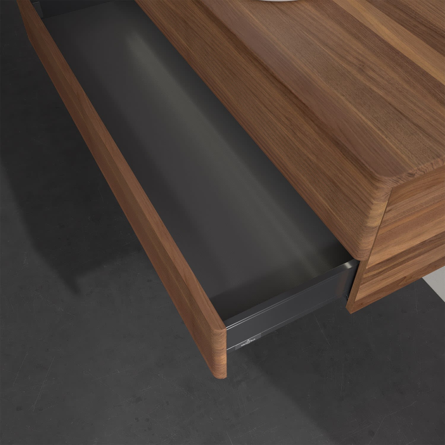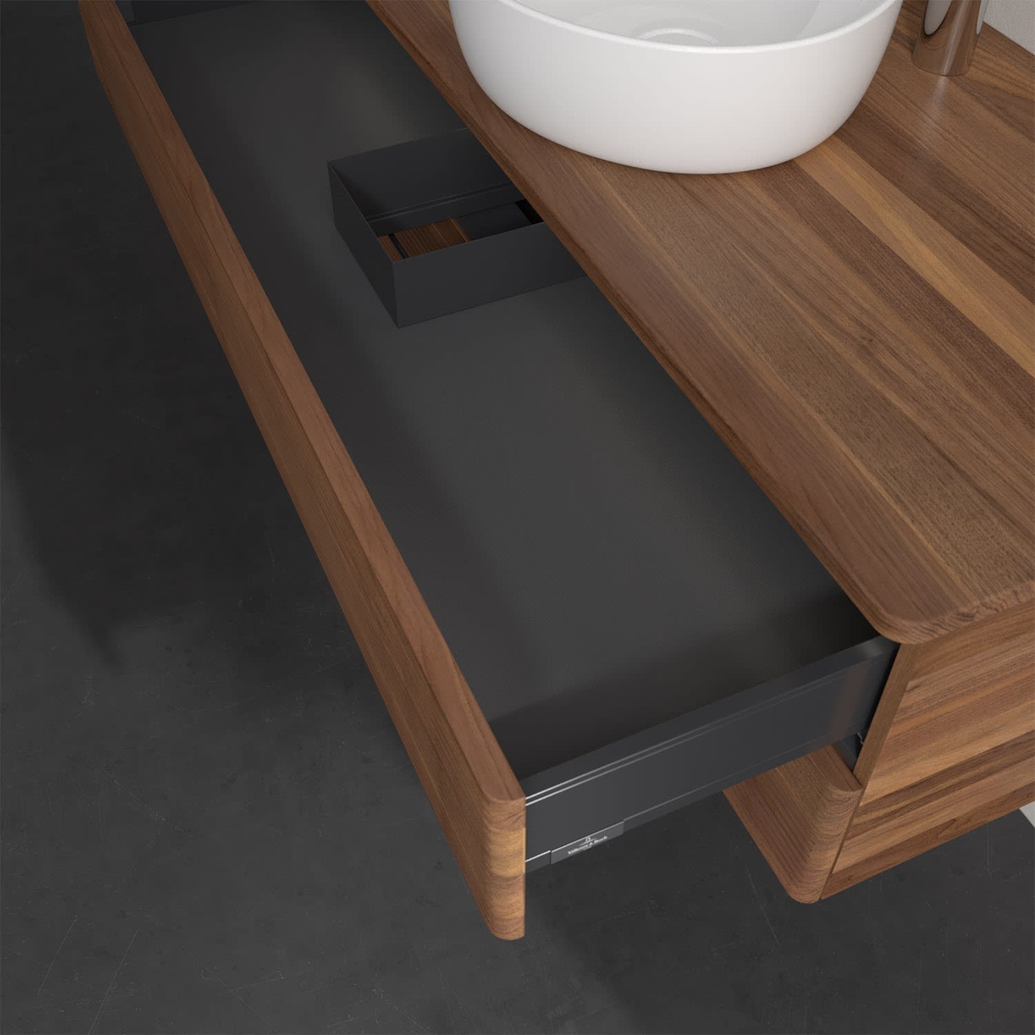 Der wandhängende Antao Waschtischunterschrank von Villeroy & Boch bietet nicht nur jede Menge Stauraum – er ist dank seines naturinspirierten Designs mit seinen abgerundeten Kanten auch noch besonders stilvoll und schafft eine gemütliche Atmosphäre im Badezimmer. Auf der Waschtischplatte bietet sich rechts und links neben dem Waschtisch viel Platz für Zahnbürstenbecher oder Seifenspender. Zwei geräumige Auszüge bieten viel Platz, um alles Notwendige zu verstauen und Ordnung zu halten. Öffnen lassen sie sich durch leichten Druck auf die strukturierte Front. Dabei aktiviert sich übrigens die Auszugsbeleuchtung in angenehmem Warmweiß. Dank Vollauszug hat man immer alles im Blick und der Antirutschboden verhindert ein Umfallen oder Verrutschen der Gegenstände. Einfach clever! Für eine besonders leichte Pflege sorgt die mehrschichtig deckend lackierte Oberfläche. Bei der Ausführung in Massivholz wird dank des verarbeiteten Massivholzes jedes Möbel zu einem Unikat, das sich durch das lebendige Naturmaterial durch seine einzigartige Struktur und Maserung auszeichnet.