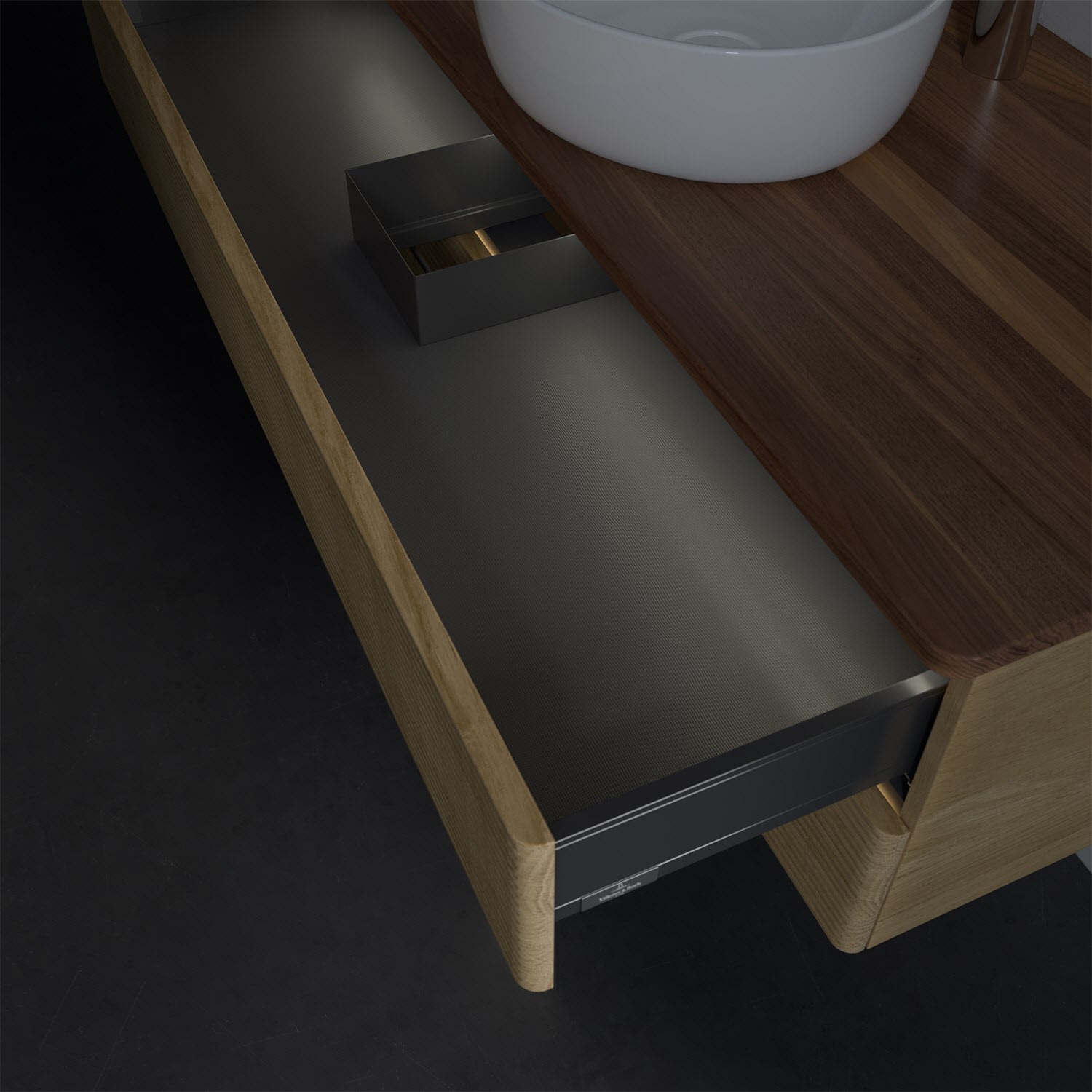 - in Schublade integrierte LED-Leiste mit warmweißem Licht zur Beleuchtung des Innenlebens