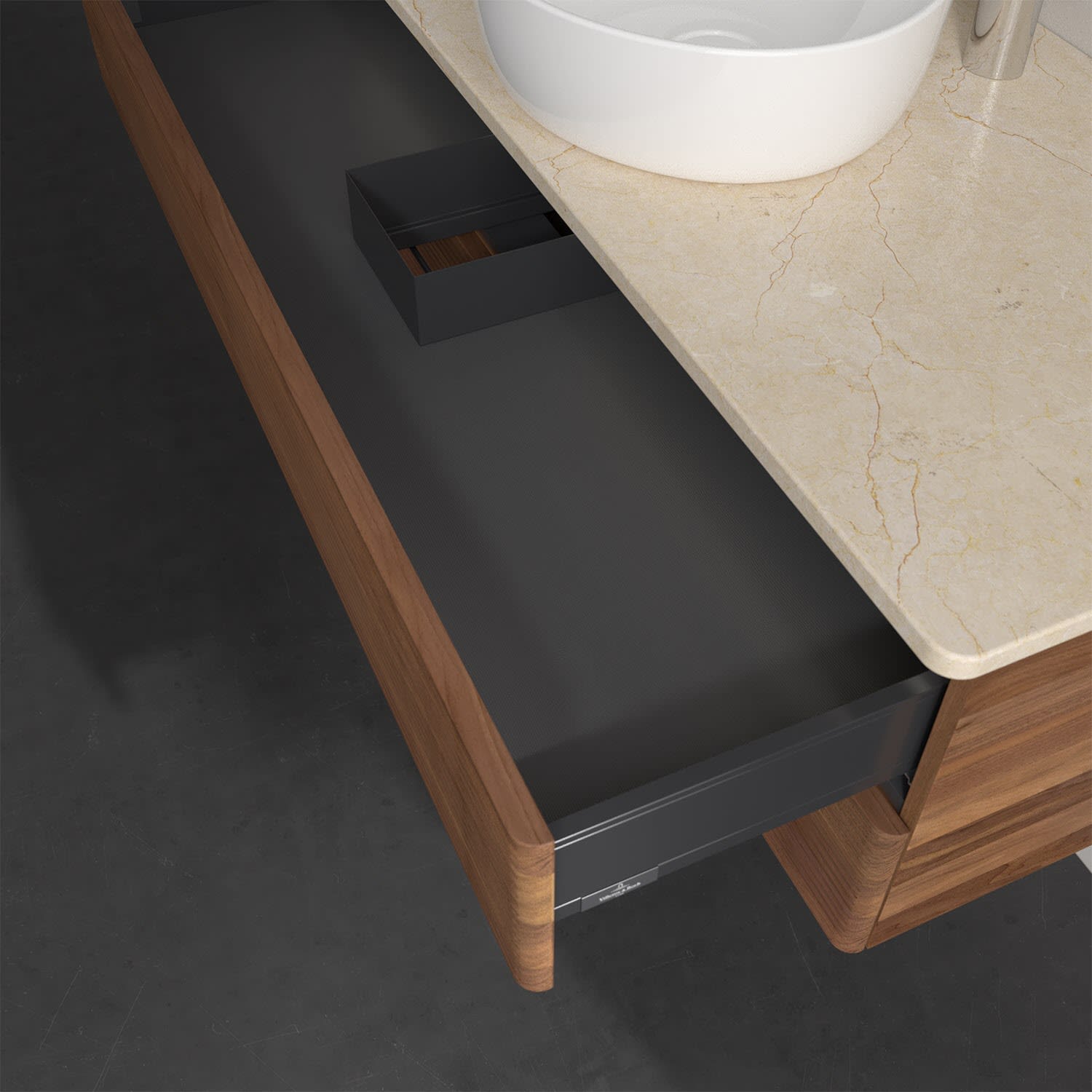 - kein Umfallen oder Verrutschen von Pflegeprodukten in den Schubladen dank rutschhemmendem Boden