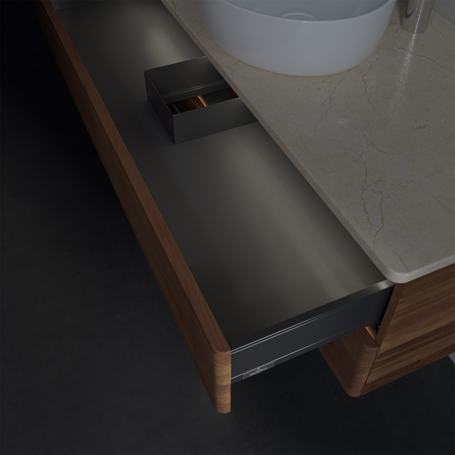 - in Schublade integrierte LED-Leiste mit warmweißem Licht zur Beleuchtung des Innenlebens