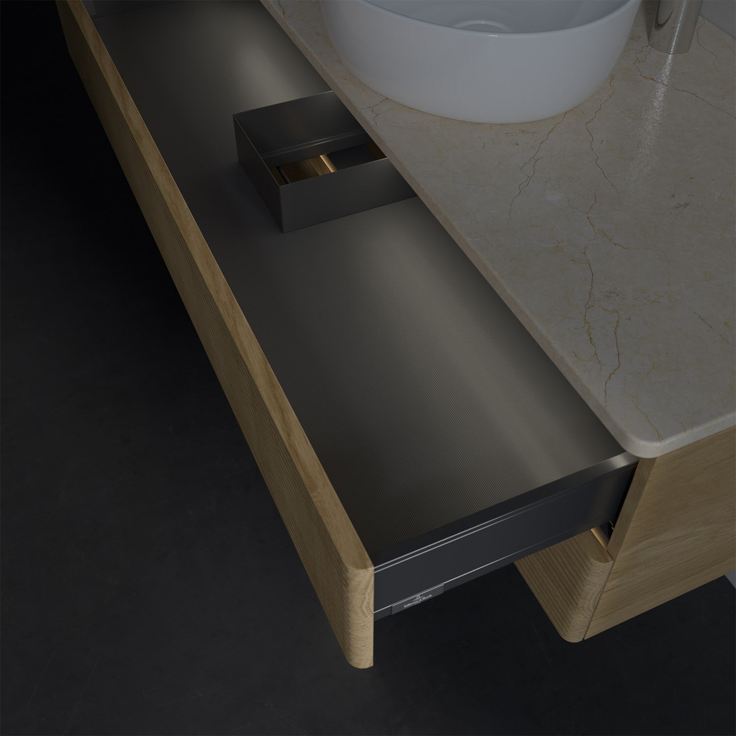 - in Schublade integrierte LED-Leiste mit warmweißem Licht zur Beleuchtung des Innenlebens