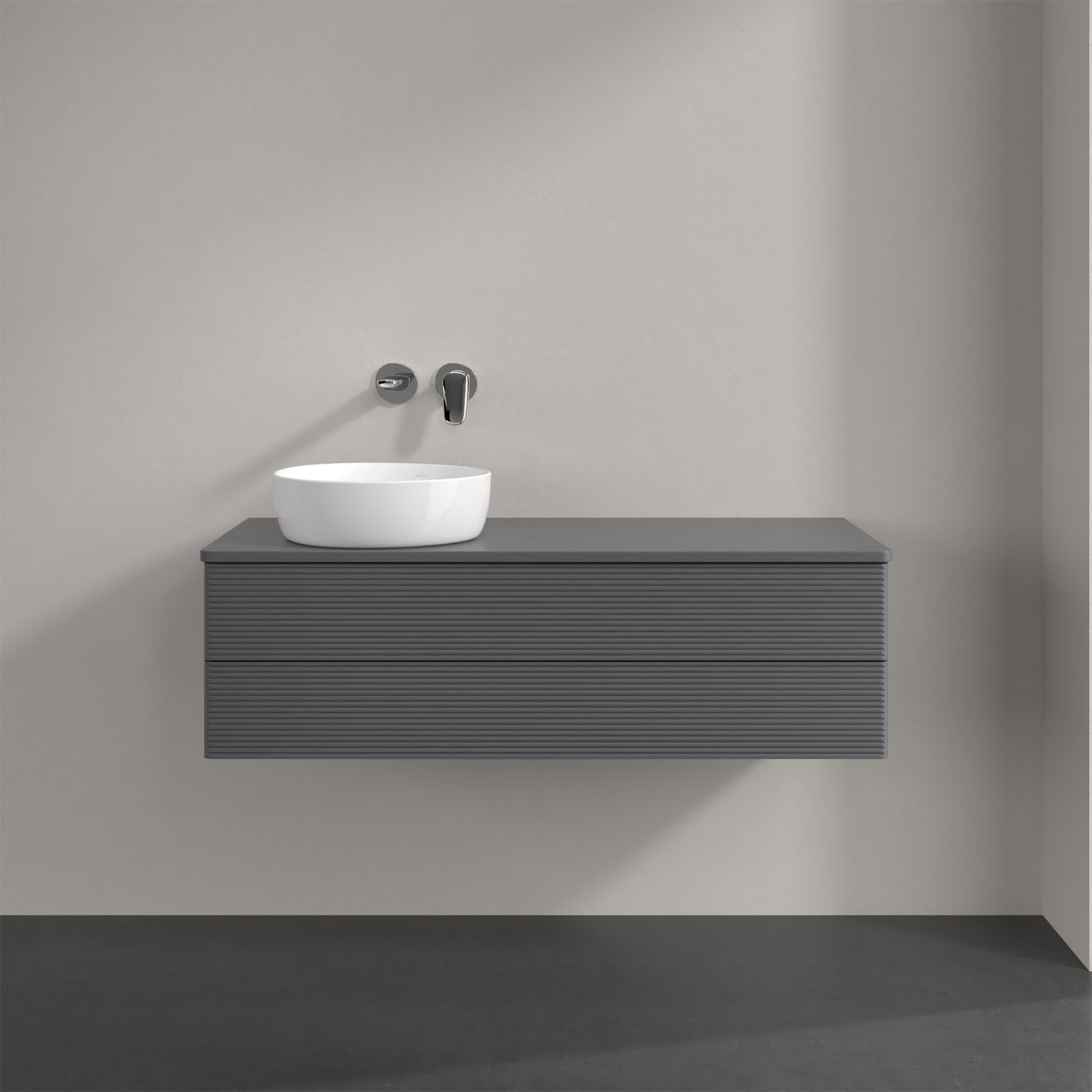 Villeroy & Boch Antao Waschbeckenunterschrank, 120 x 36 cm, 2 Auszüge mit LED-Licht, Front mit Struktur, mit Hahnloch, für Waschtisch links