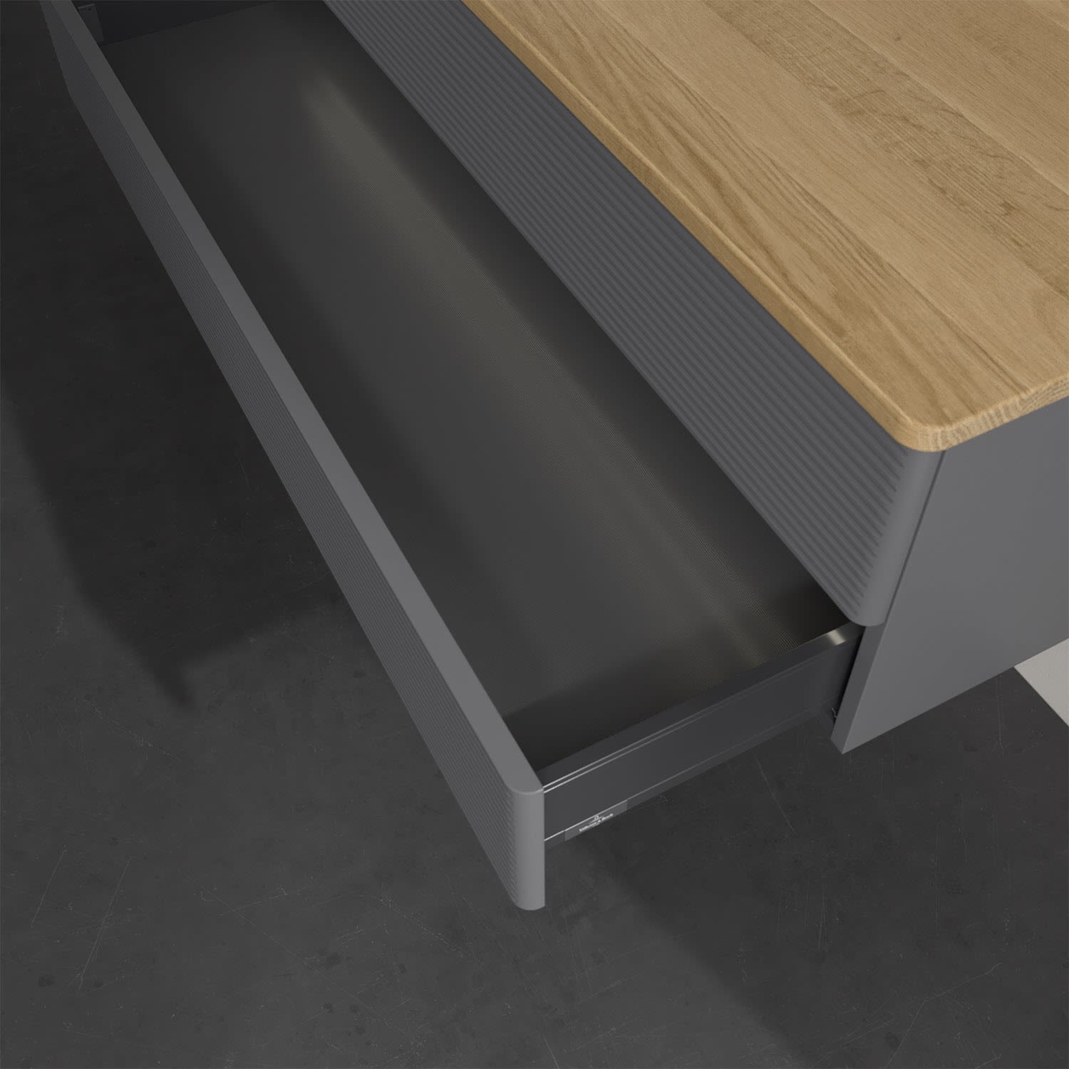 Der wandhängende Antao Waschtischunterschrank von Villeroy & Boch bietet nicht nur jede Menge Stauraum – er ist dank seines naturinspirierten Designs mit seinen abgerundeten Kanten auch noch besonders stilvoll und schafft eine gemütliche Atmosphäre im Badezimmer. Auf der Waschtischplatte bietet sich seitlich des Waschtischs viel Platz für Zahnbürstenbecher oder Seifenspender. Zwei geräumige Auszüge bieten viel Platz, um alles Notwendige zu verstauen und Ordnung zu halten. Öffnen lassen sie sich durch leichten Druck auf die strukturierte Front. Dabei aktiviert sich übrigens die Auszugsbeleuchtung in angenehmem Warmweiß. Dank Vollauszug hat man immer alles im Blick und der Antirutschboden verhindert ein Umfallen oder Verrutschen der Gegenstände. Einfach clever! Für eine besonders leichte Pflege sorgt die mehrschichtig deckend lackierte Oberfläche. Bei der Ausführung in Massivholz wird dank des verarbeiteten Massivholzes jedes Möbel zu einem Unikat, das sich durch das lebendige Naturmaterial durch seine einzigartige Struktur und Maserung auszeichnet.